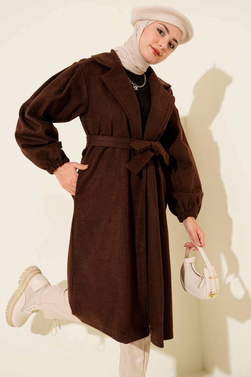 Kruvaze Yaka Balon Kol Kuşaklı Kaban Füme