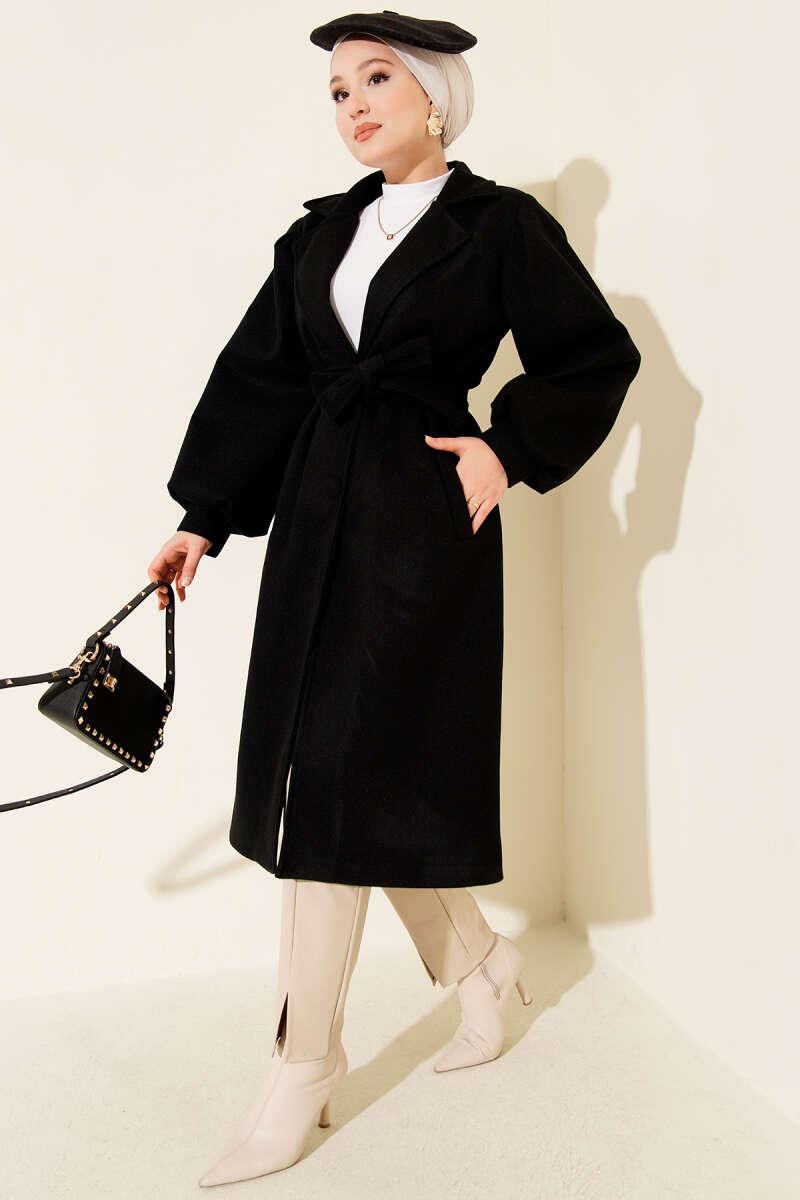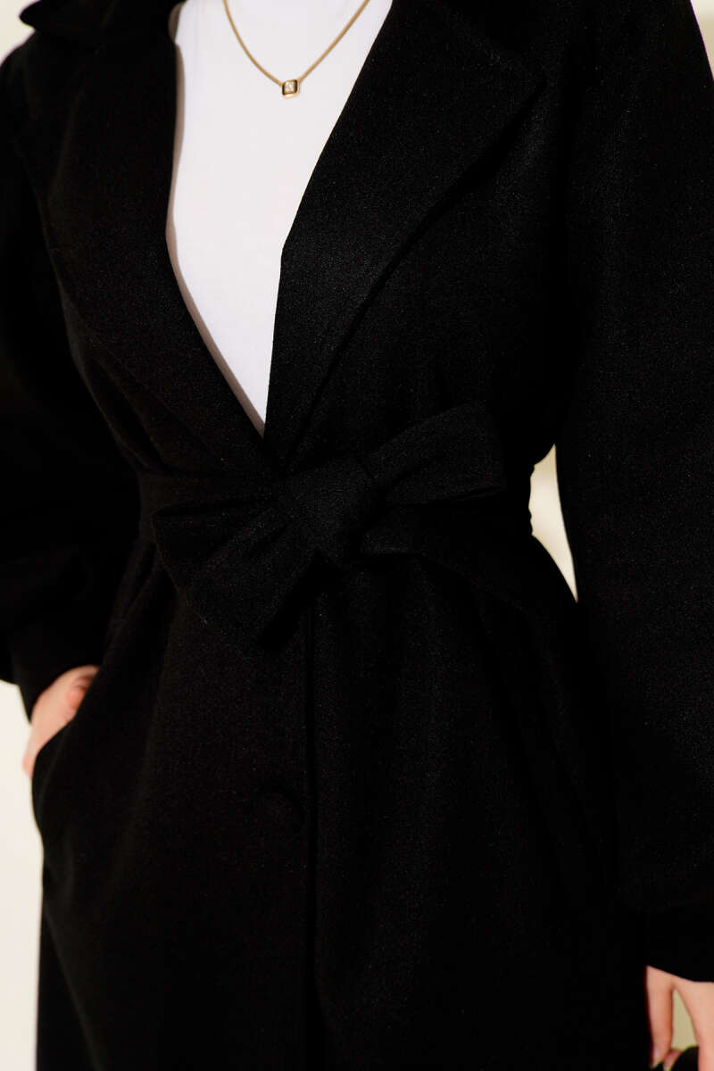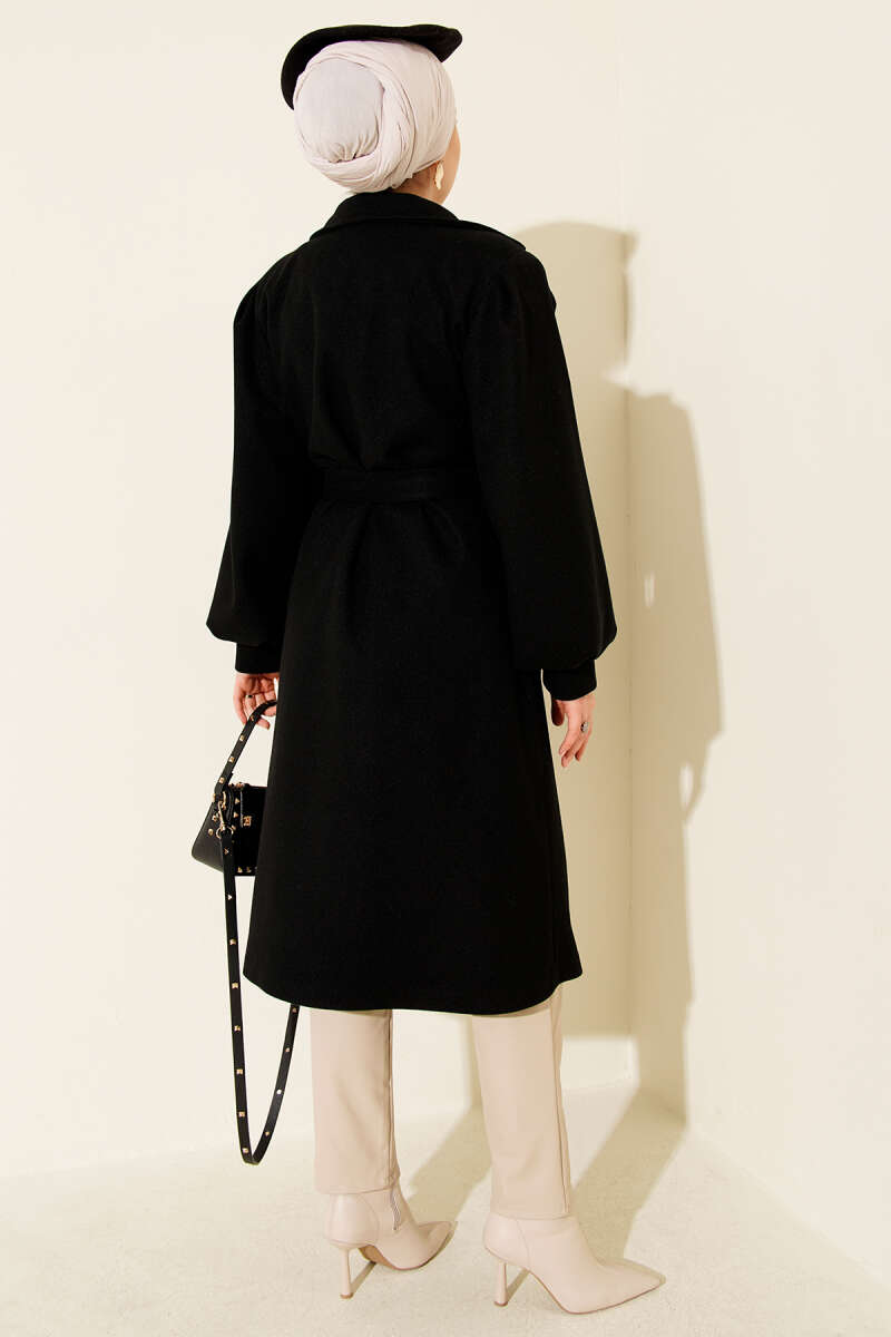 Kruvaze Yaka Balon Kol Kuşaklı Kaşe Kaban Siyah