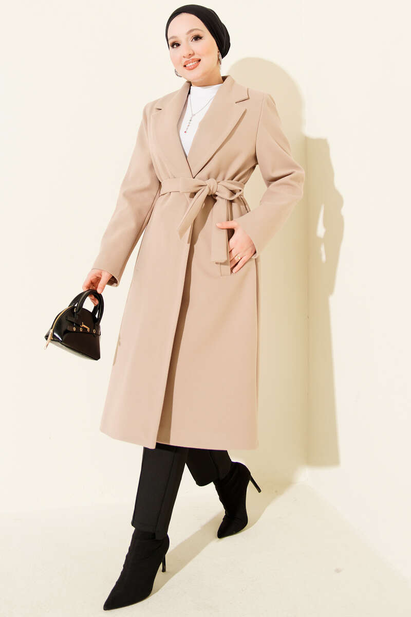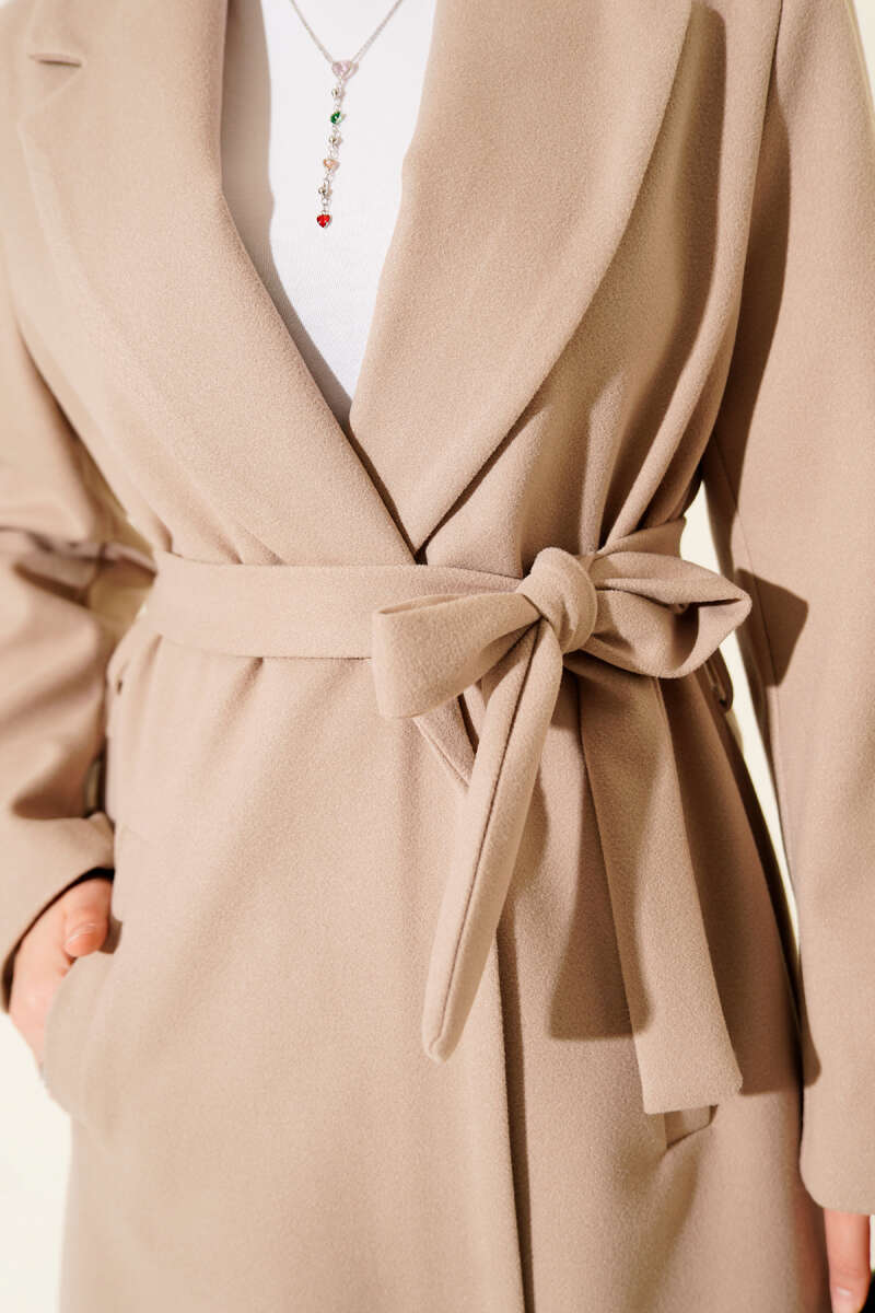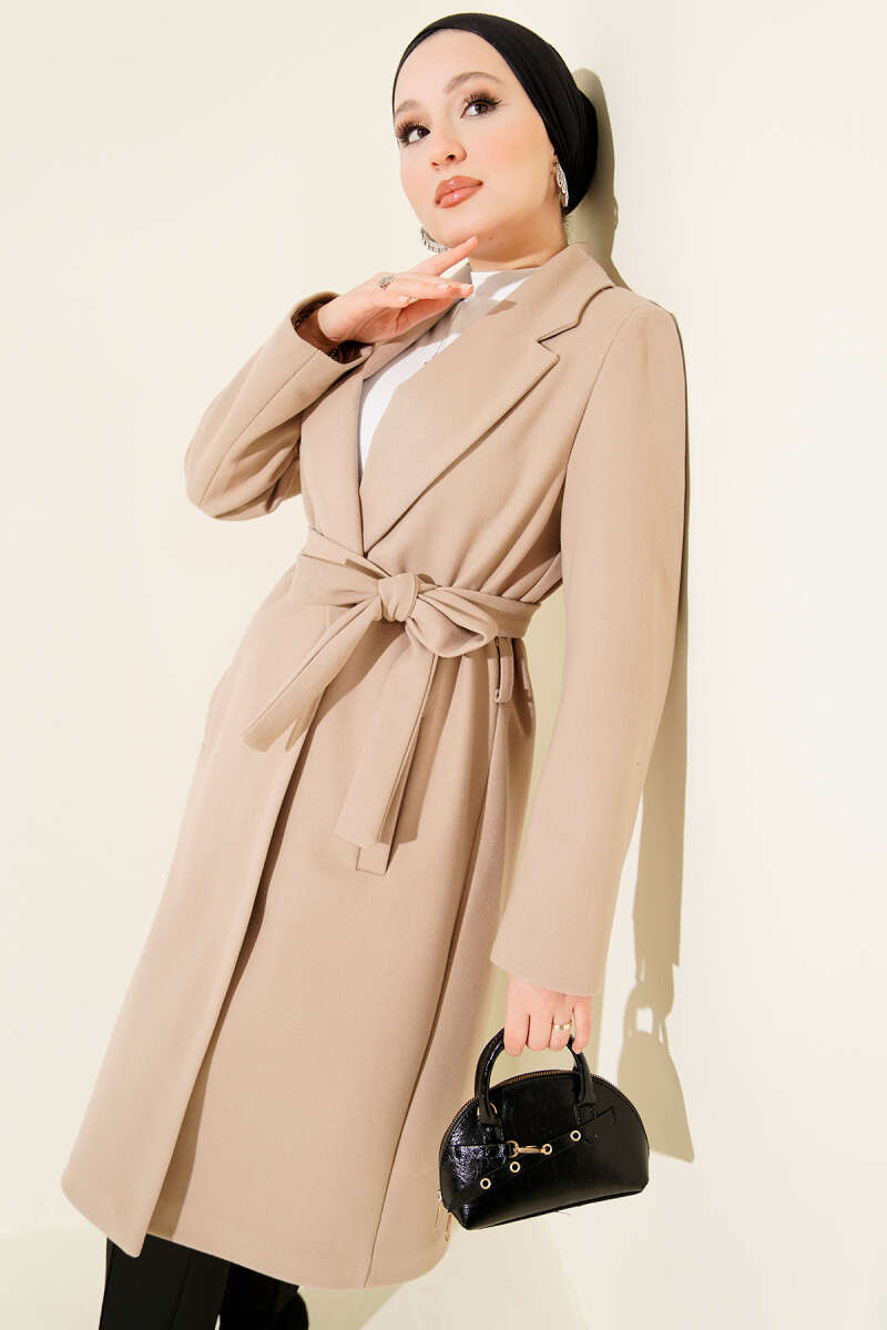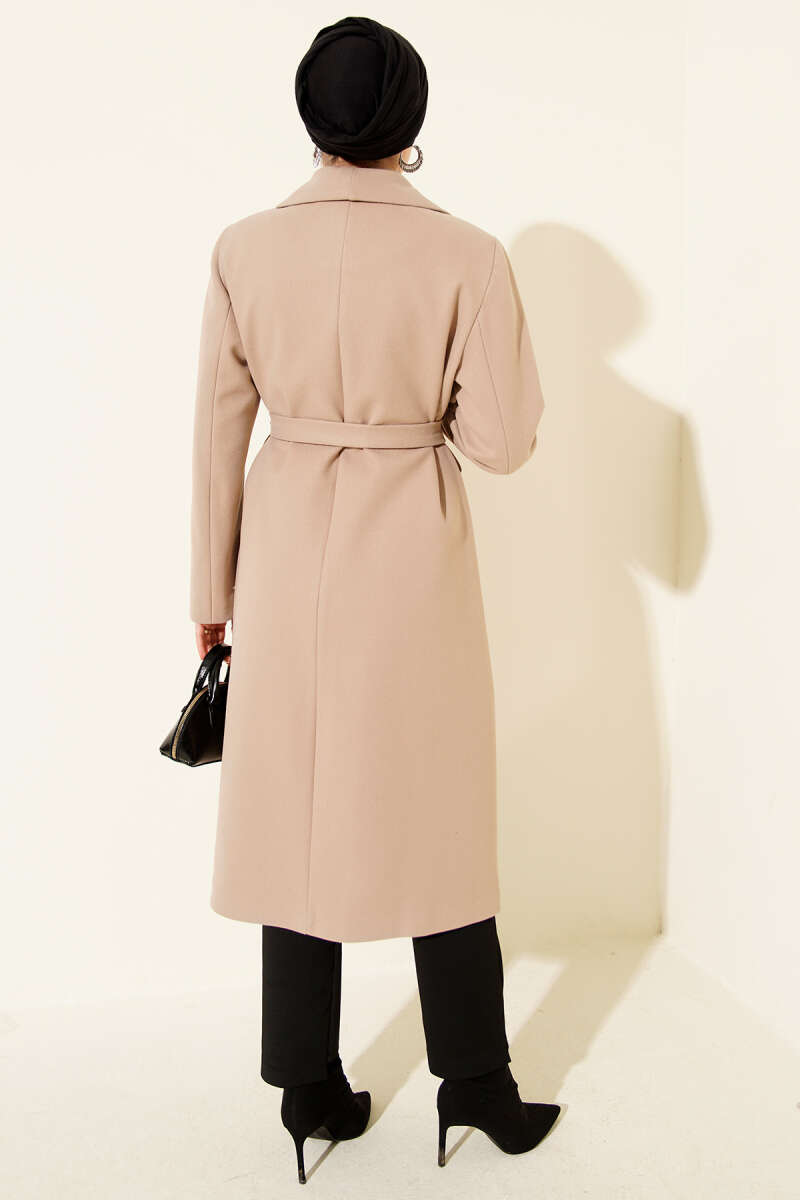 Kruvaze Yakalı Kuşaklı Uzun Kaşe Kaban Bej