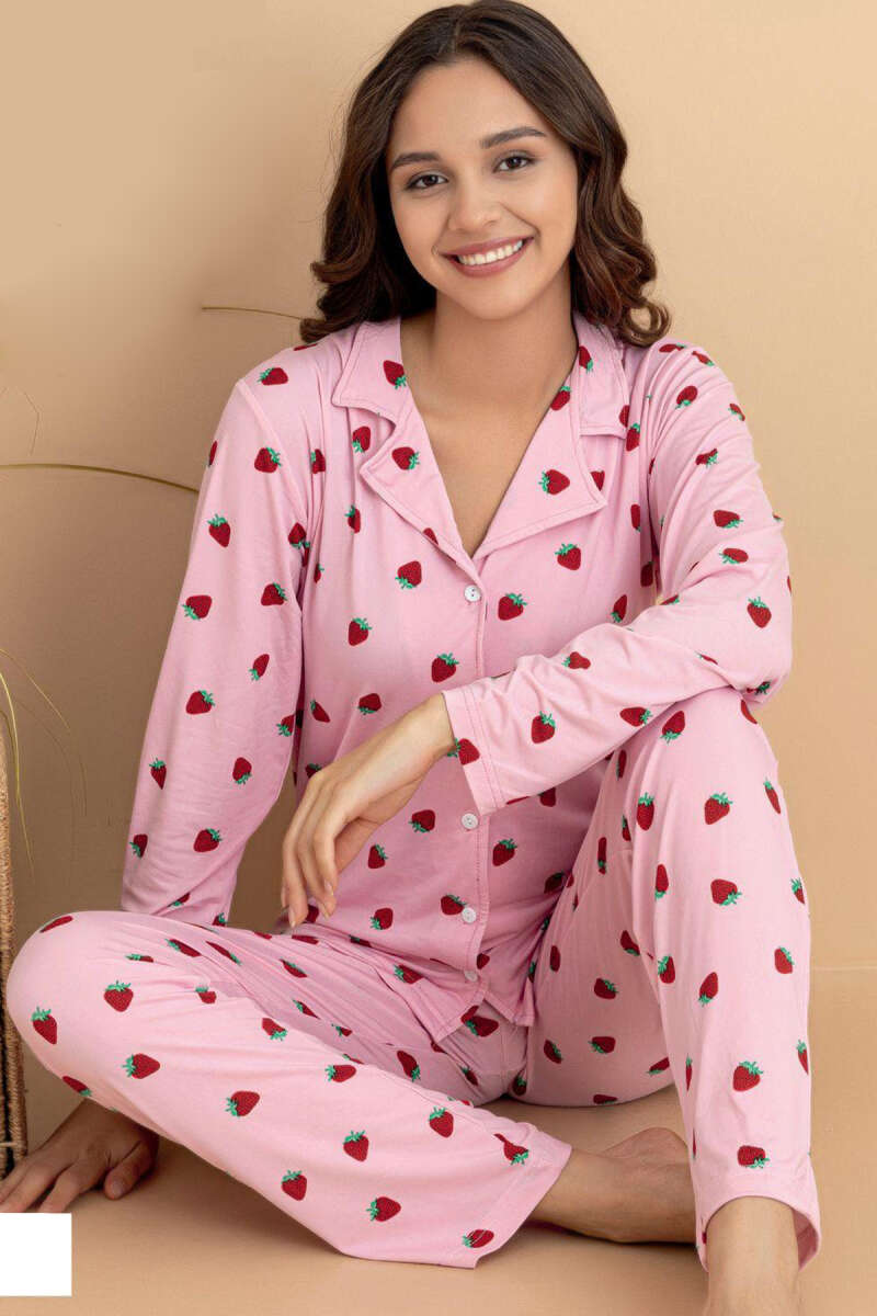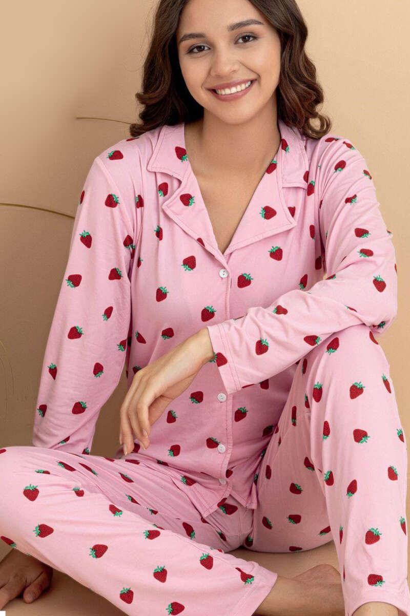 Kruvaze Yaka Çilek Baskılı Pijama Takımı Pembe