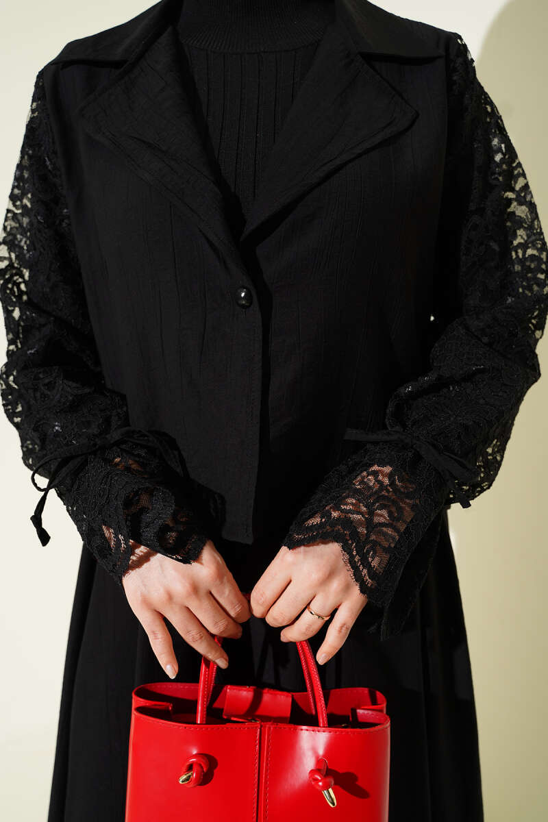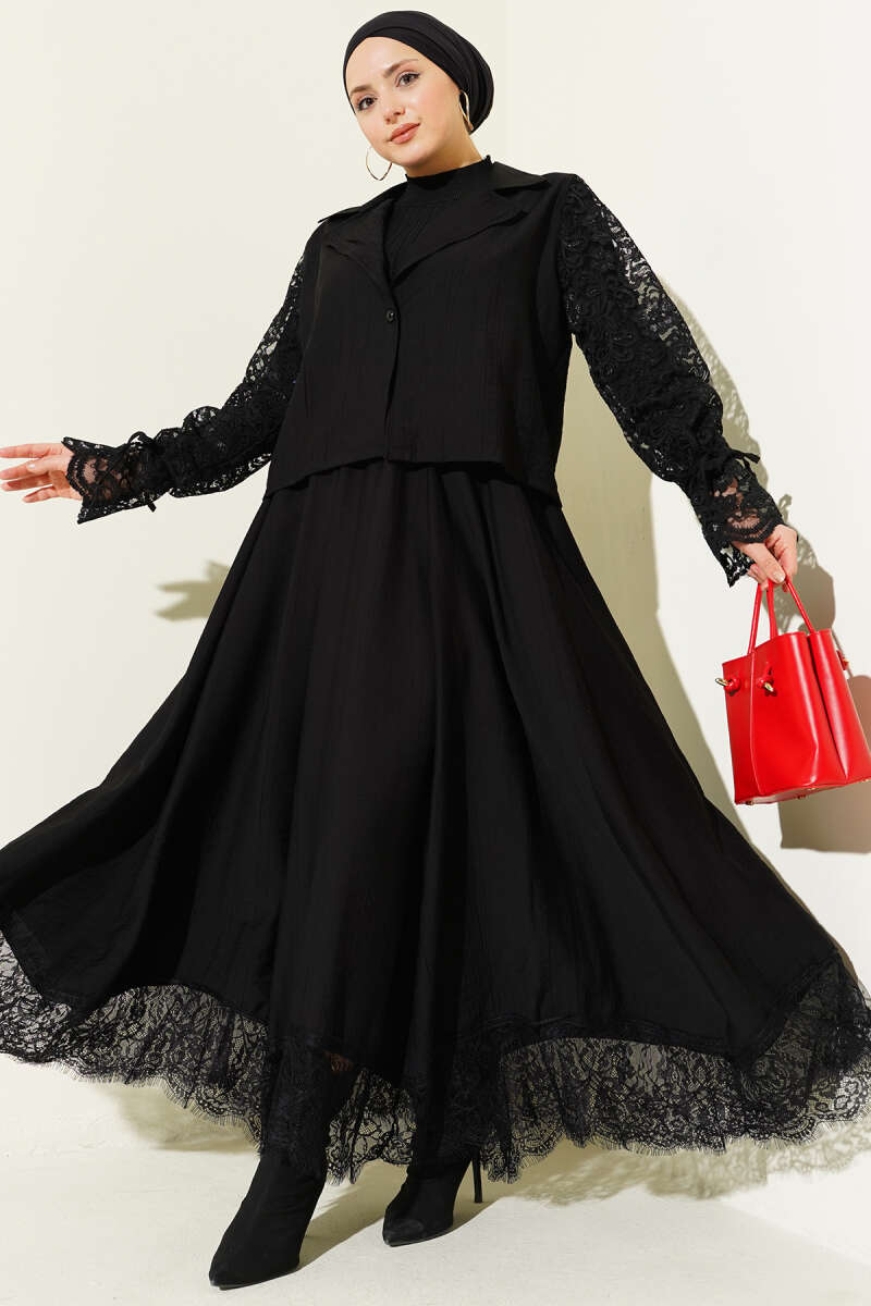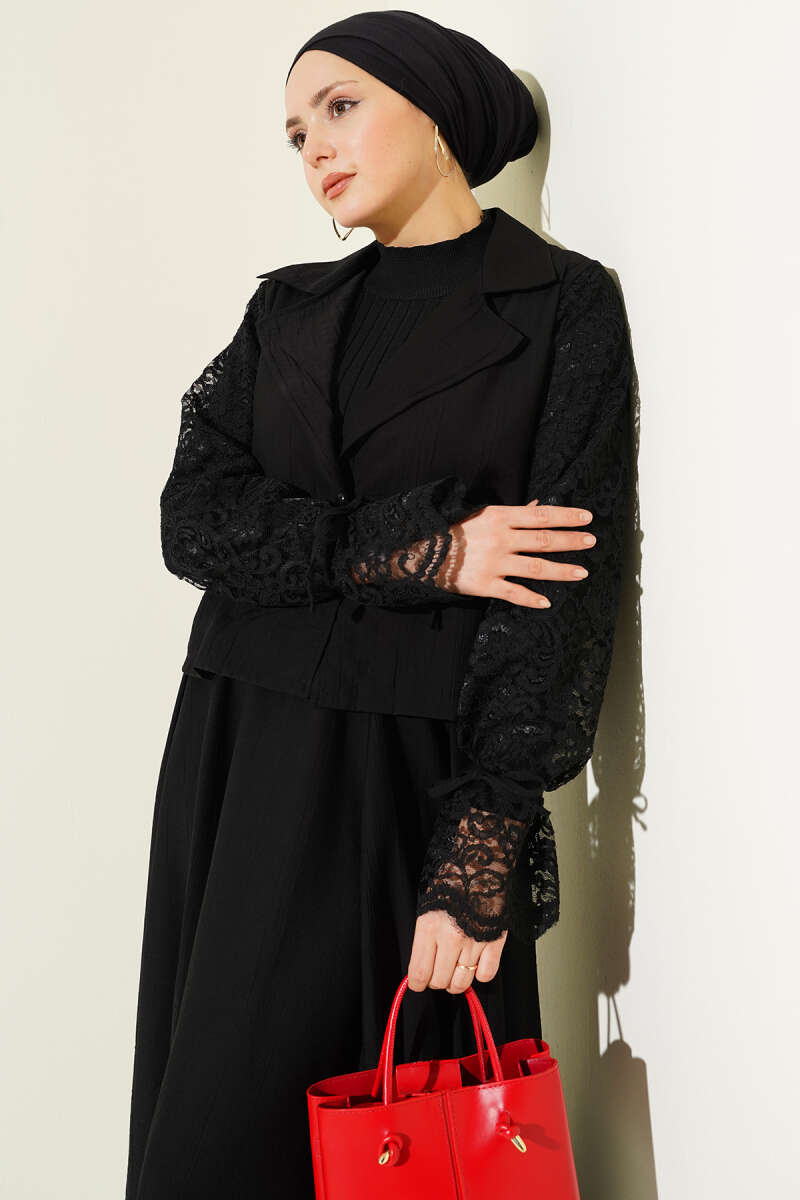 Kruvaze Yaka Dantelli Etekli İkili Takım Siyah