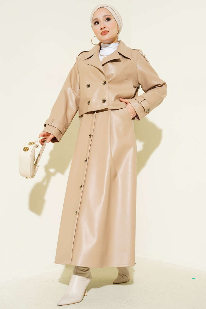 Kuşaklı Rüzgarlıklı Uzun Kaşe Kaban Ekru