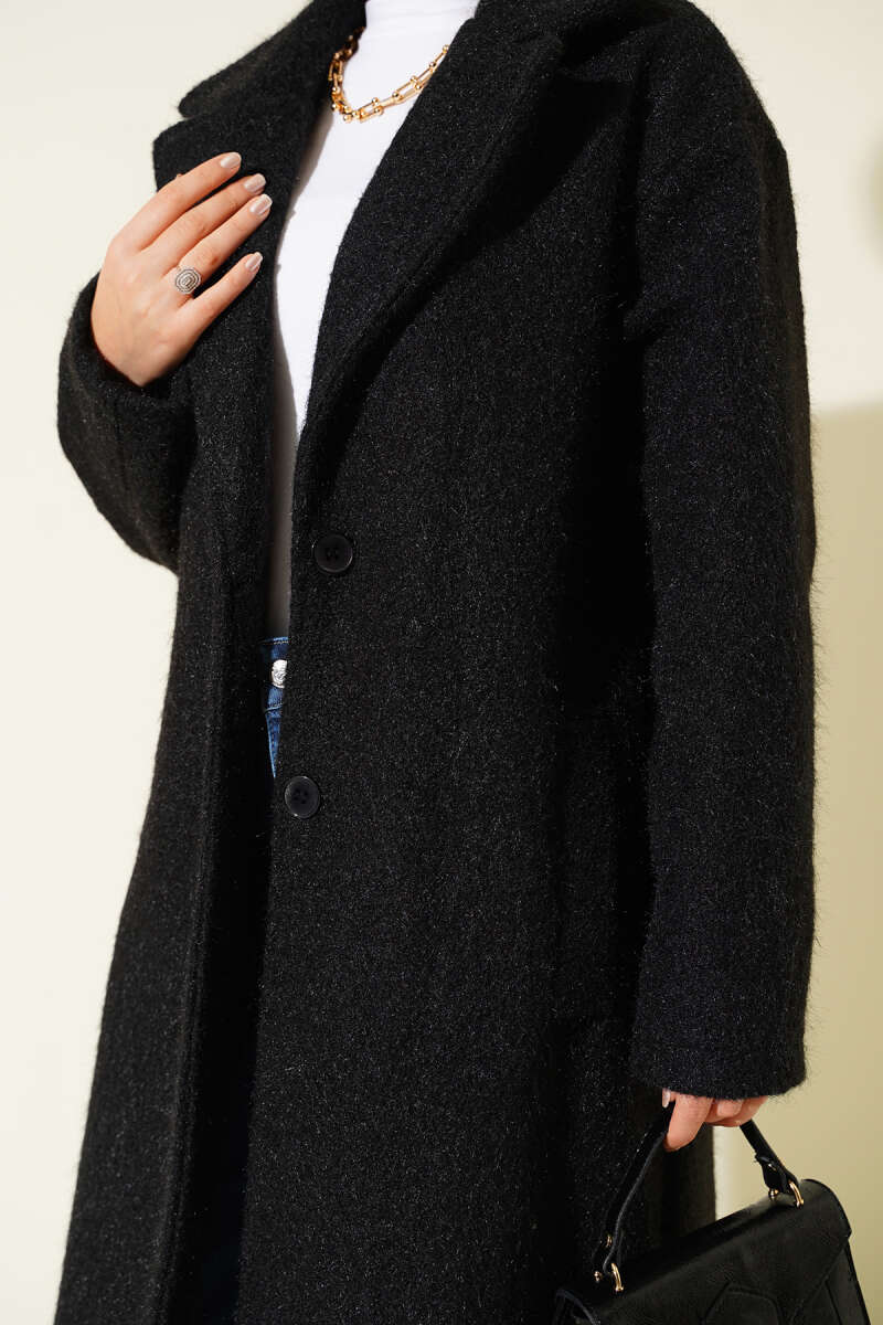 Kuşaklı Uzun Kaşe Kaban Siyah