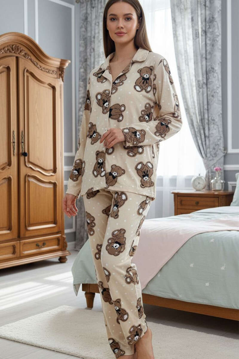 Kruvaze Yaka Düğmeli Ayıcık Desenli Süet Pijama Takımı Bej