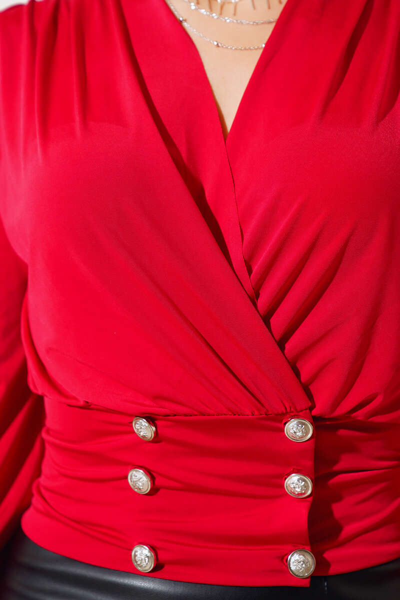 Sezonun şık parçası bluzumuz favorilerinizin arasında yerini alacak. Bluzumuzun önü düğmeli modeldir. Kruvaze yaka bluzumuzun önüz büzgülü modeldir.