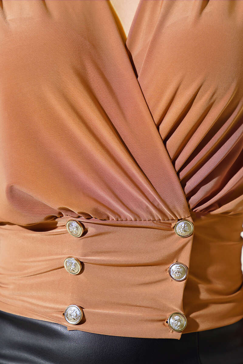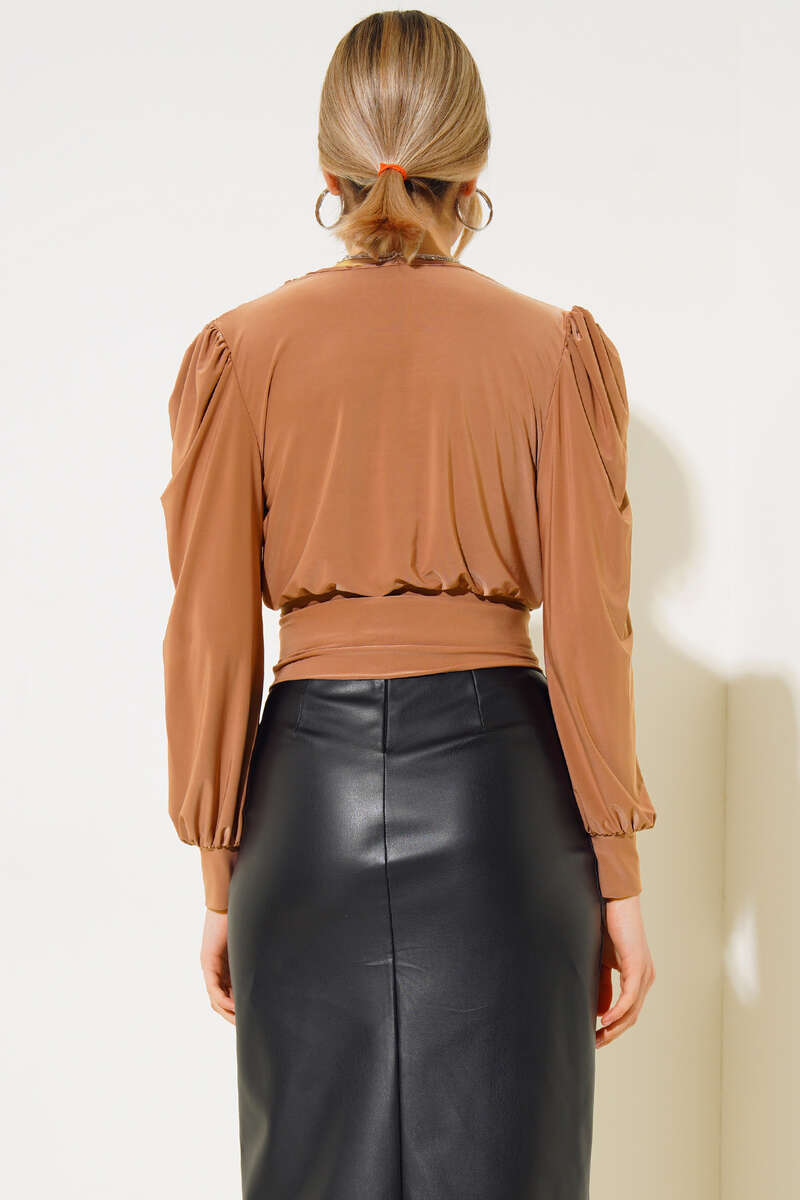 Sezonun şık parçası bluzumuz favorilerinizin arasında yerini alacak. Bluzumuzun önü düğmeli modeldir. Kruvaze yaka bluzumuzun önüz büzgülü modeldir.