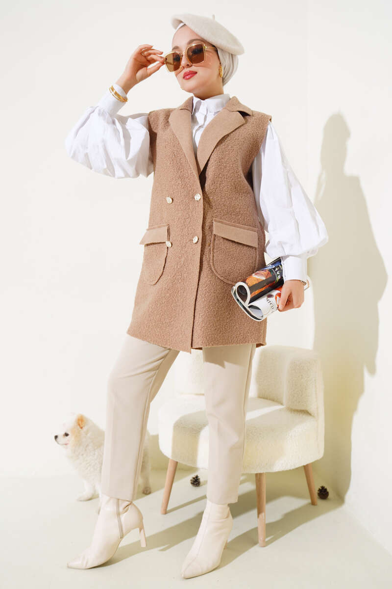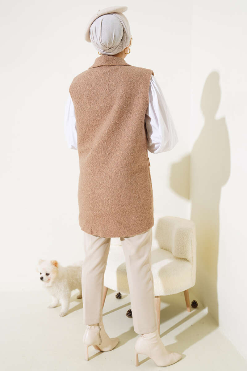 Kruvaze Yaka Düğmeli Buklet Yelek Vizon