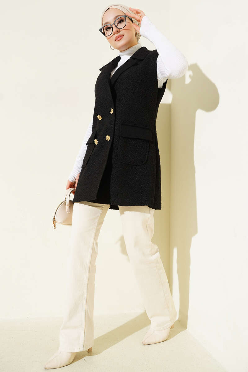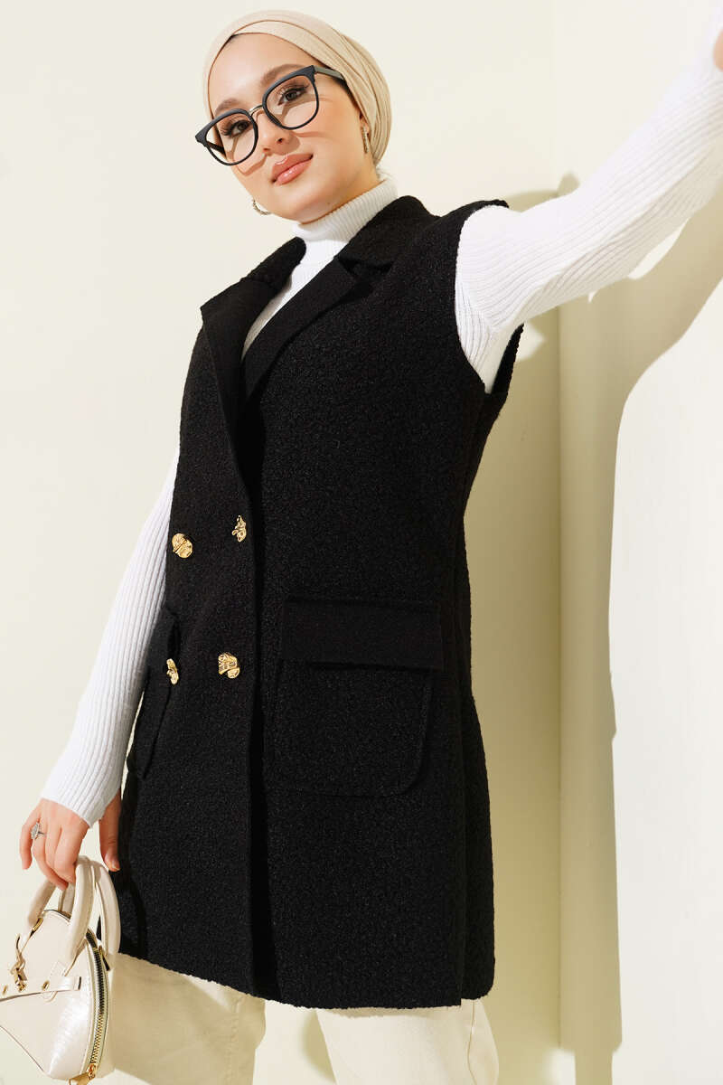 Gold Düğmeli Kemerli Sakallı Yelek Siyah