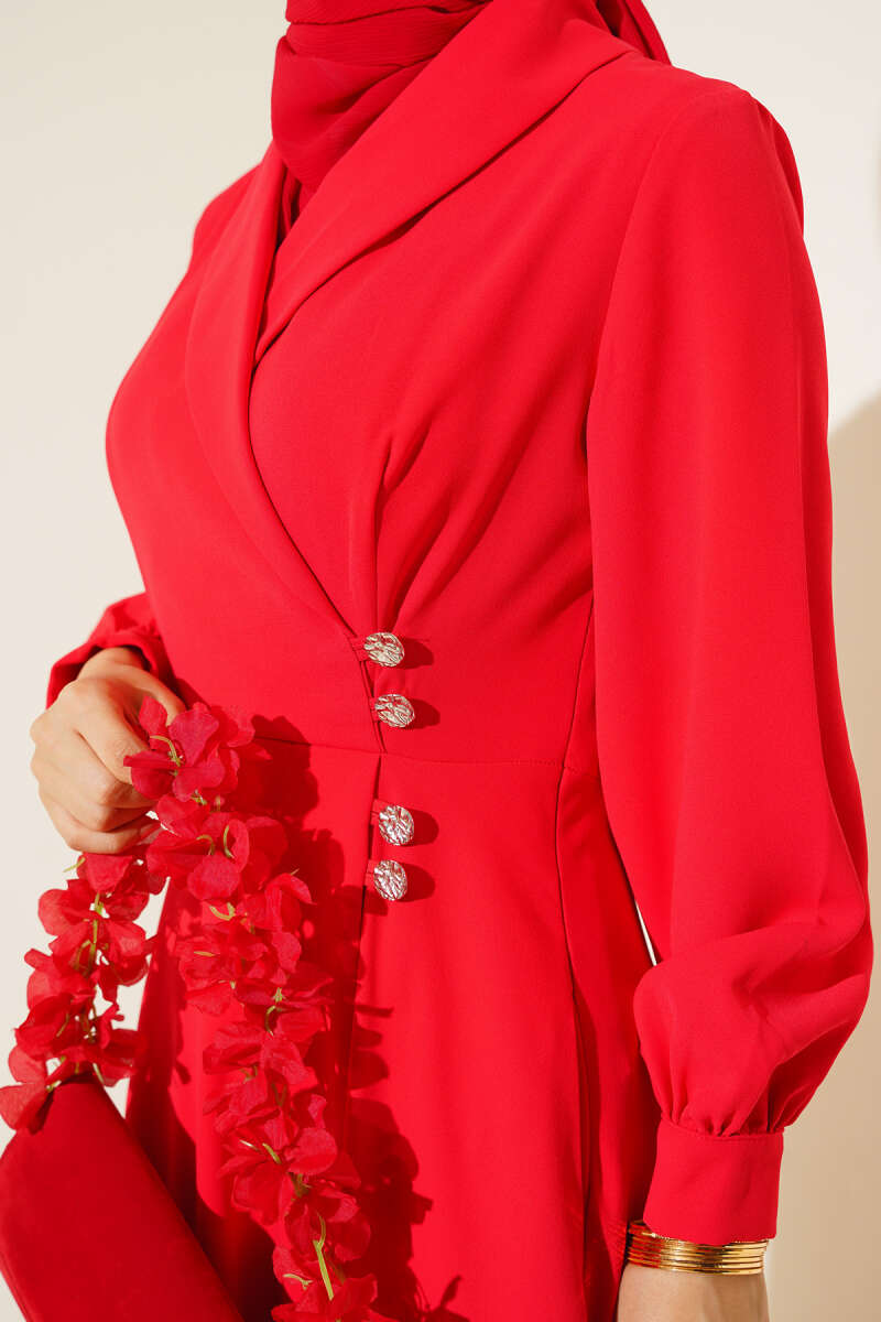 Kruvaze Yaka Düğmeli Elbise Kırmızı