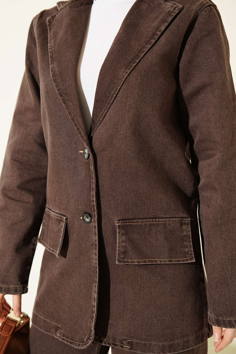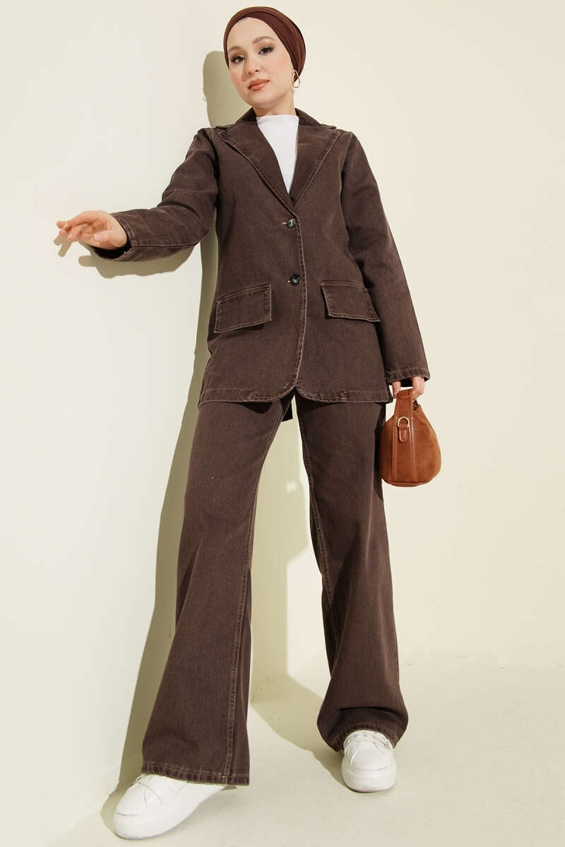 Kruvaze Yaka Düğmeli Kot İkili Takım Kahve