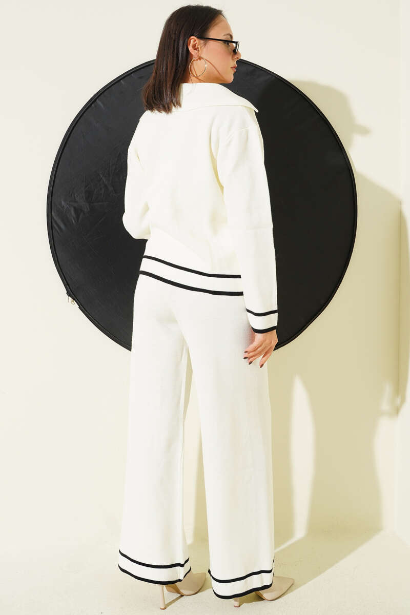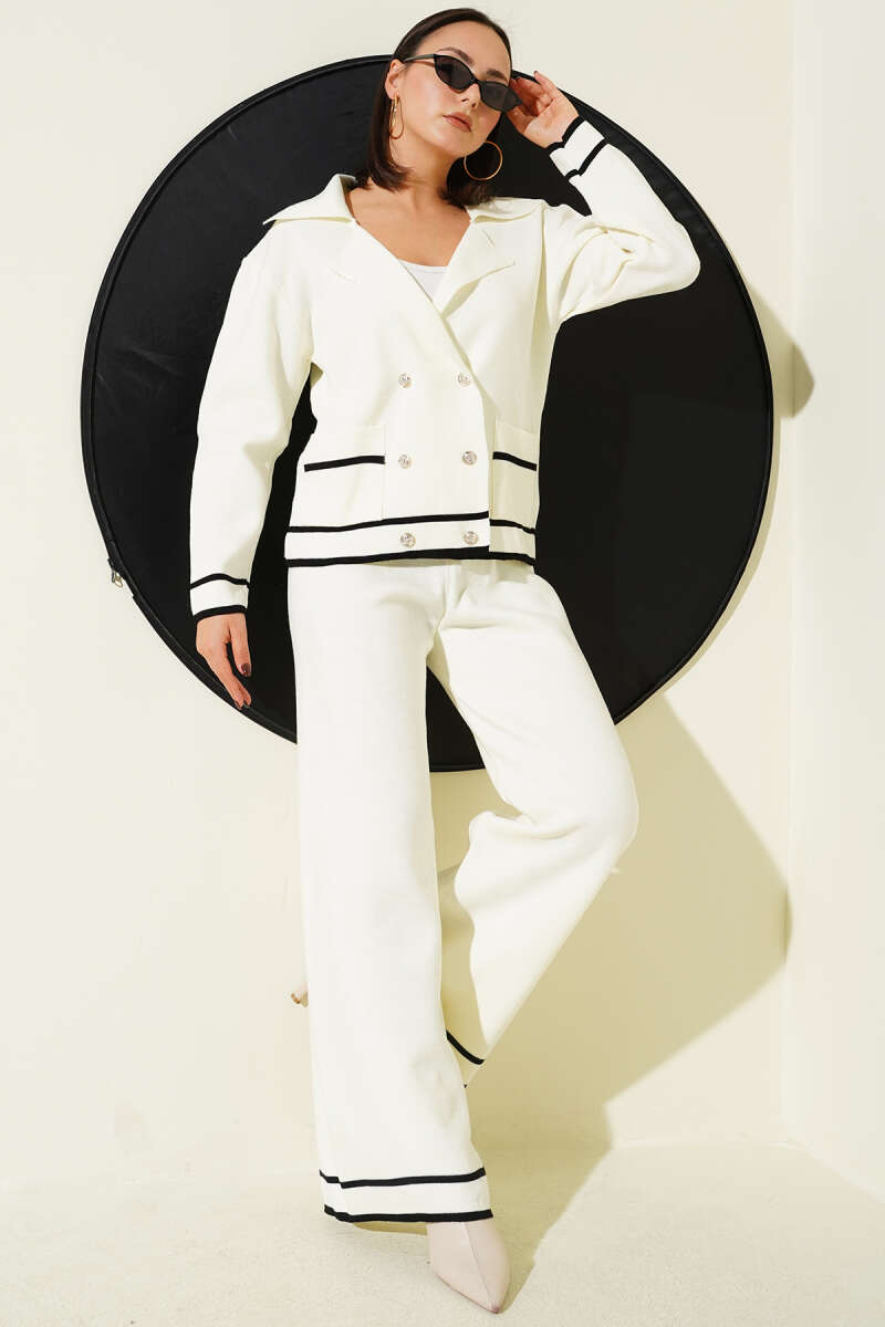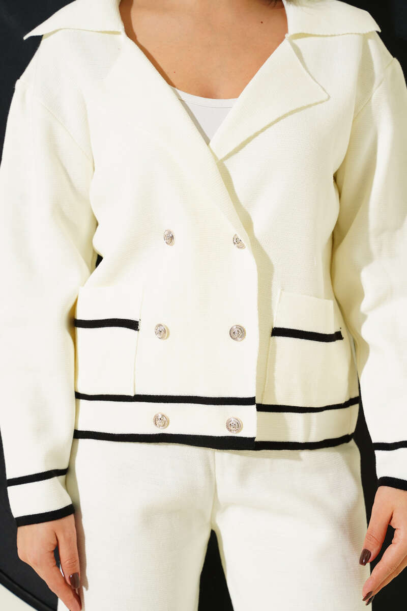 Kruvaze Yaka Düğmeli Triko İkili Takım Bej