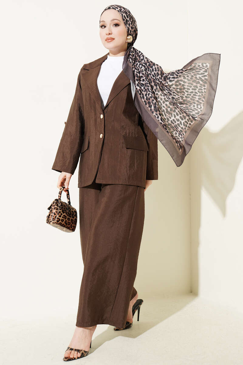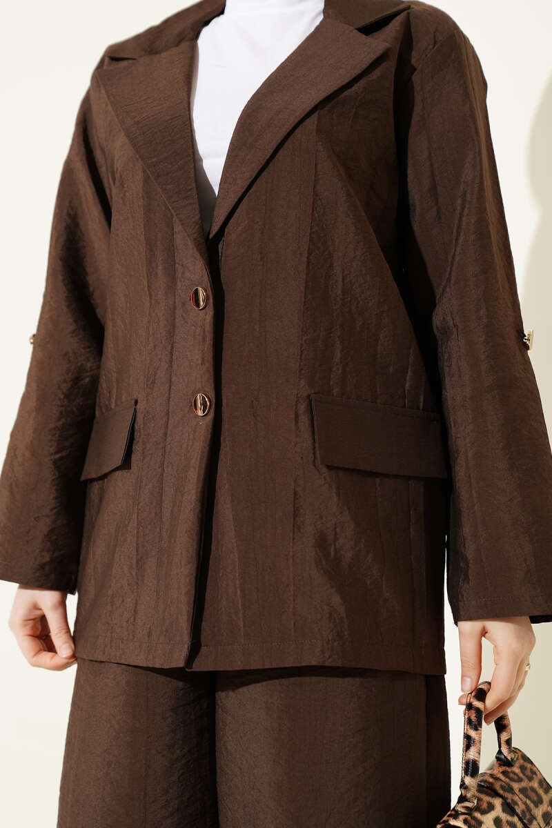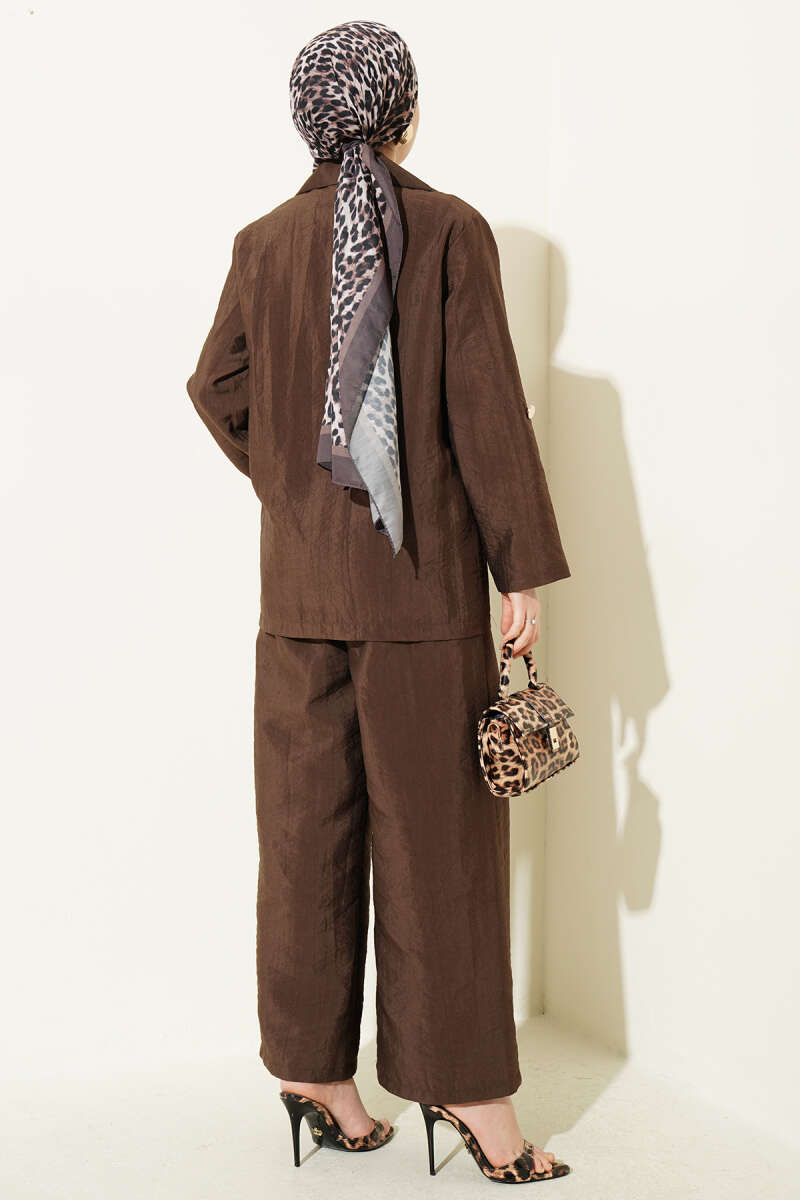 Zarif kruvaze yaka tasarımı ve gold düğme detaylarıyla maskülen çizgileri feminen bir şıklıkla harmanlayan bu takım, zamansız bir stil sunuyor. Takımın dökümlü pantolonu ve rahat kesim ceketi, hem ofis ortamında hem de şık etkinliklerde gün boyu konforlu bir kullanım sağlıyor. Dokulu kumaş yapısı ve modern kalıbı sayesinde sofistike bir duruş sergileyen bu parça, gardırobunuzun en güçlü takımlarından biri olmaya aday. Her türlü aksesuarla kolayca tamamlanabilen bu ikili, çabasız ve iddialı bir görünüm arayanlar için ideal bir tercih.