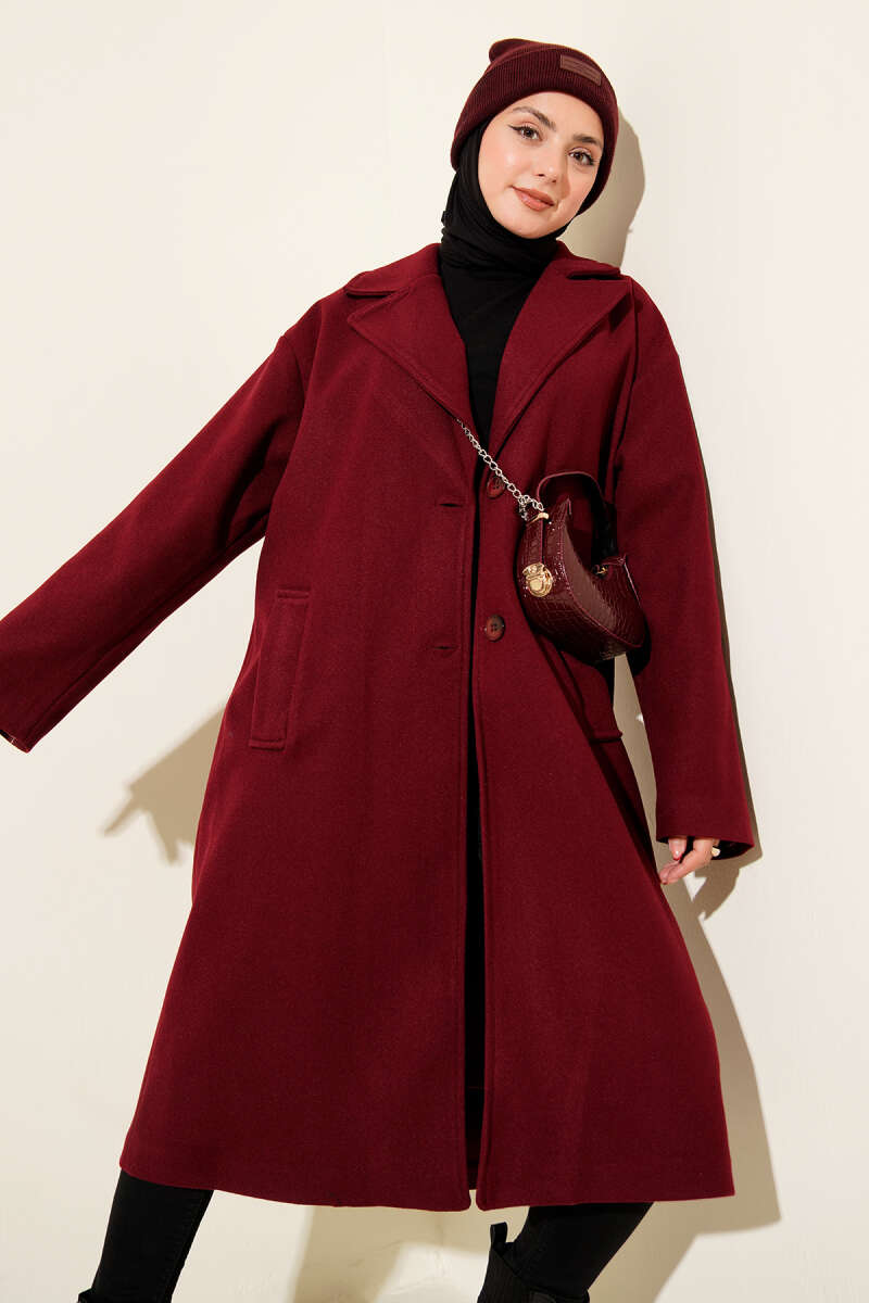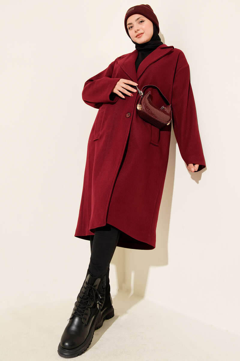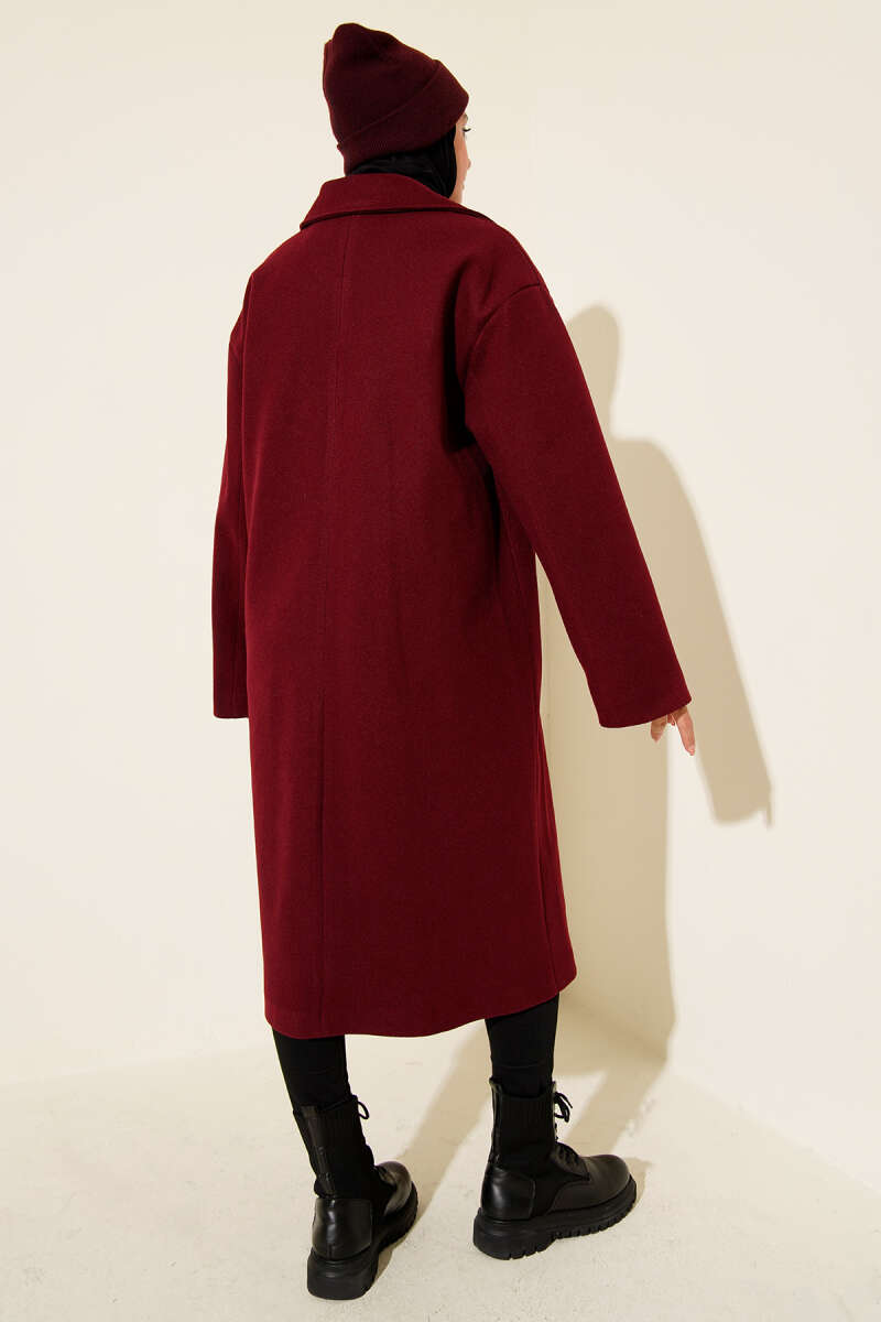 Kemerli Uzun Kaşe Kaban Bordo