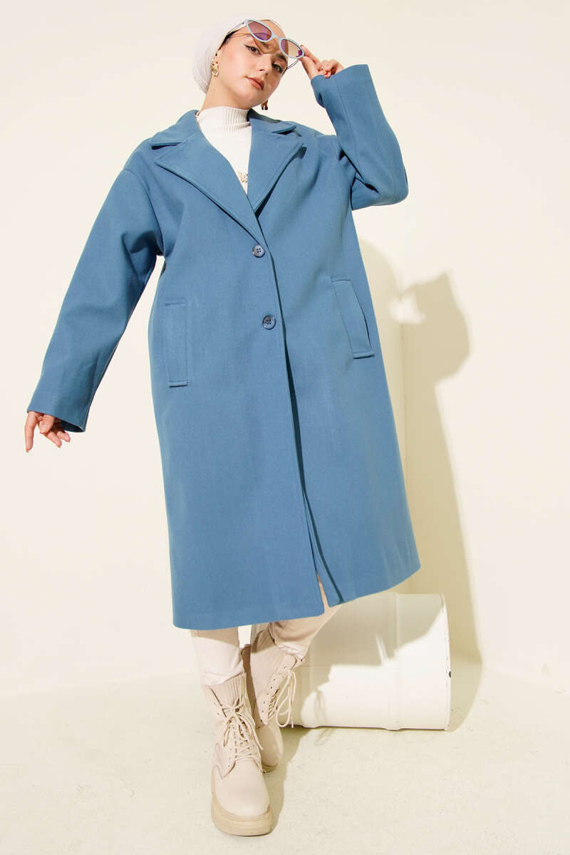 Düğmeli Kuşak Detaylı Kaşe Kaban Bej
