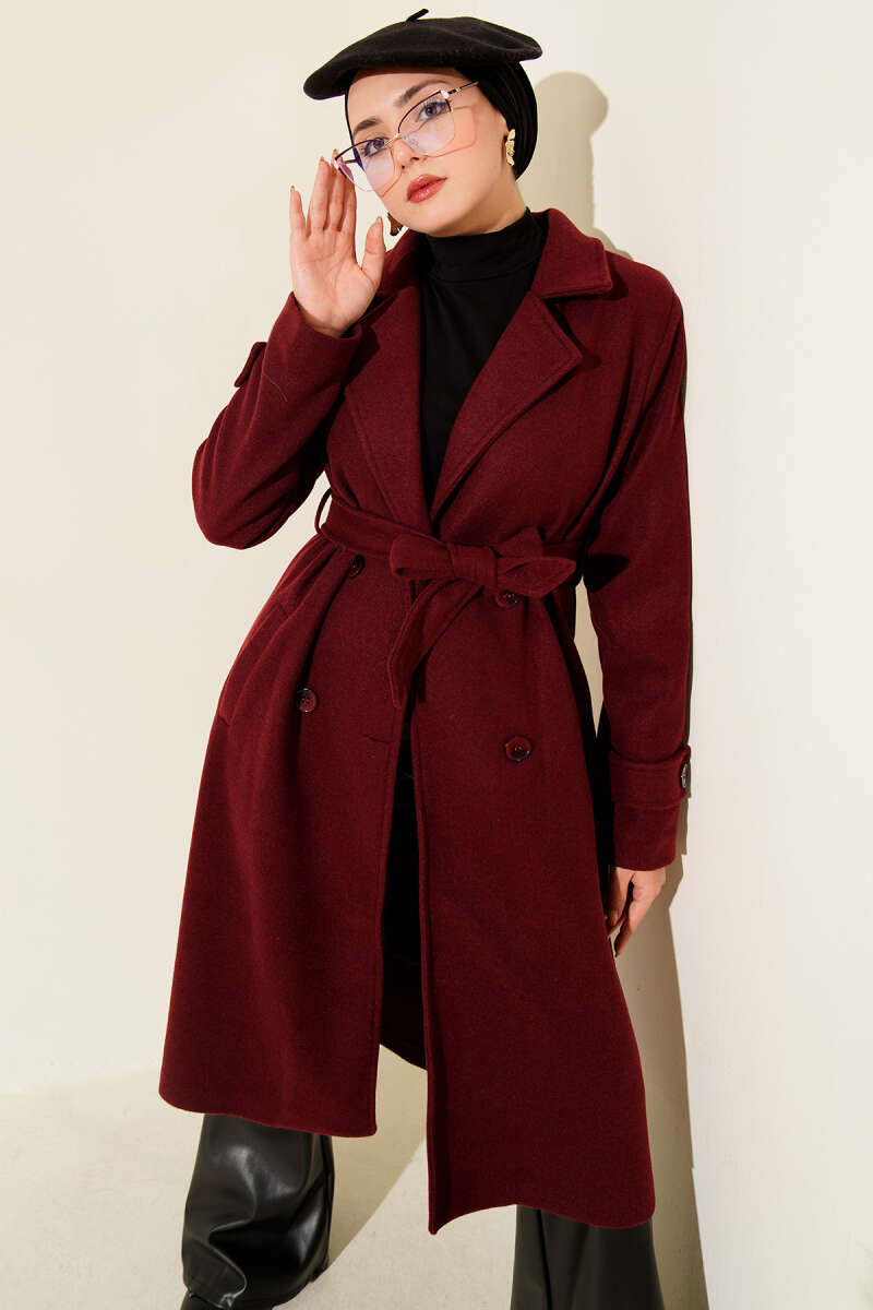 Kruvaze Yaka Balon Kol Kuşaklı Kaban Füme