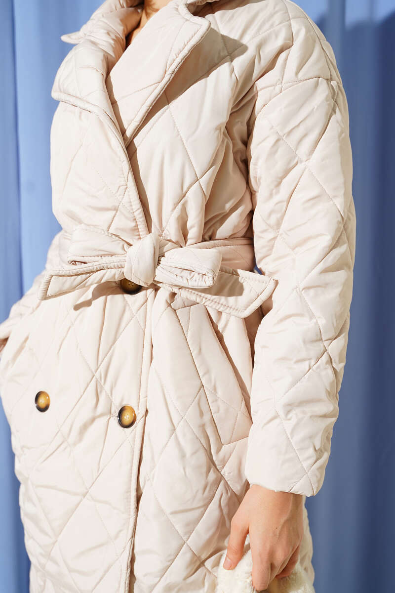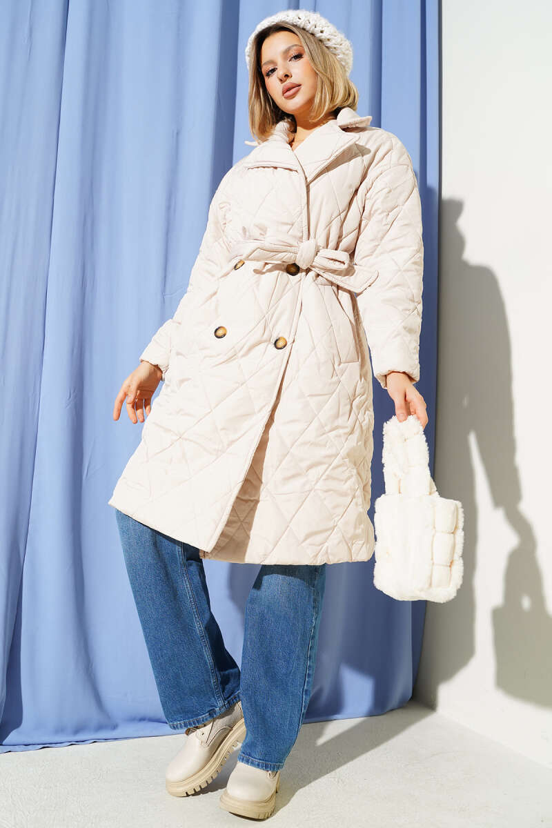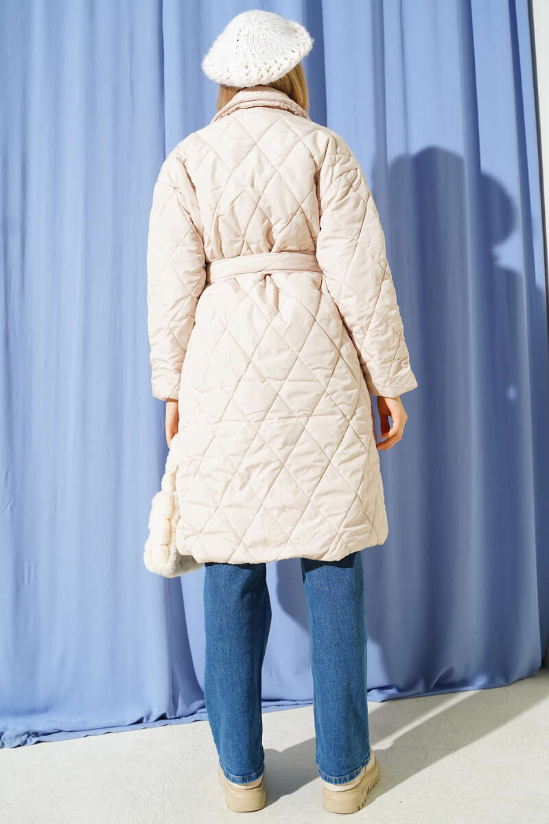 Kruvaze Yaka Kapitone Kuşaklı Mont Siyah