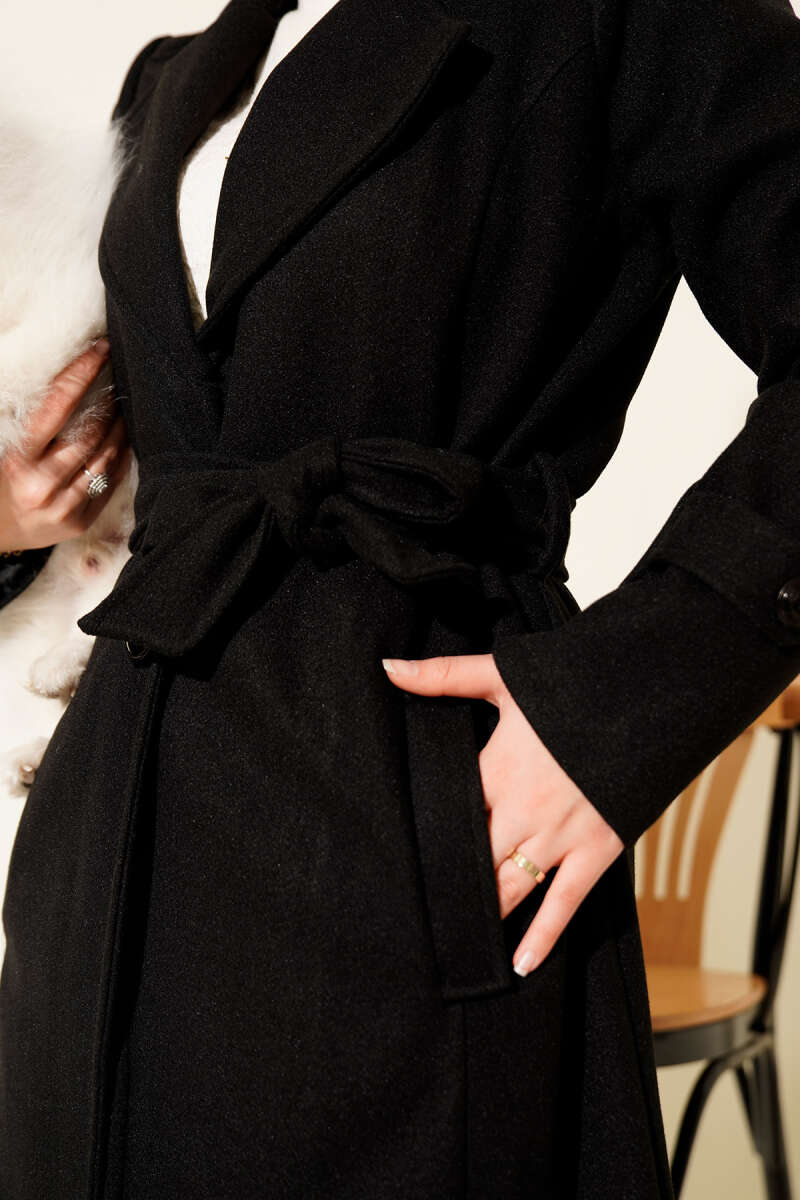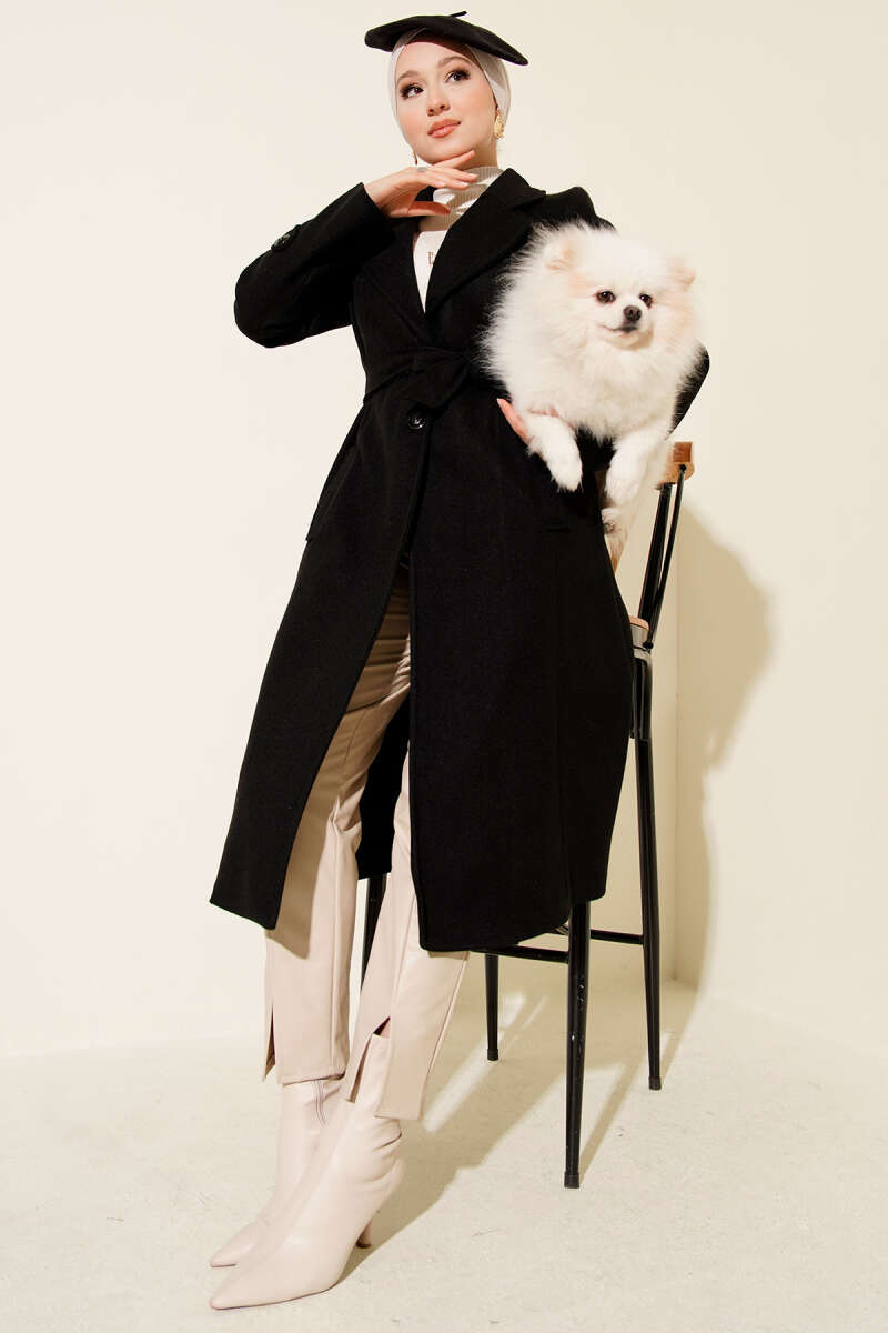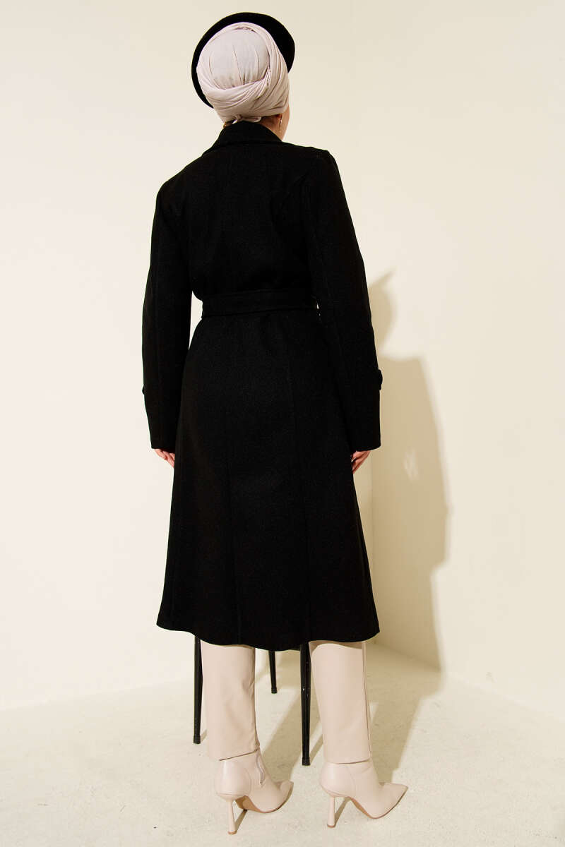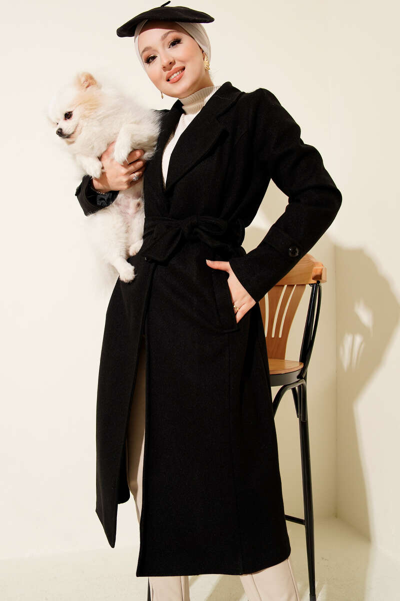 Kapüşonlu Kuşaklı Kaşe Kaban Siyah Taş