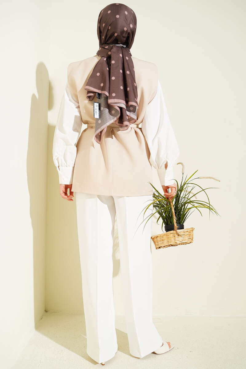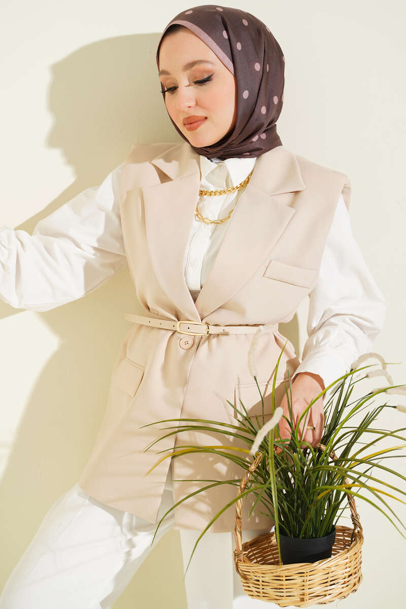 Kruvaze Yaka Kemer Detaylı Yelek Bej