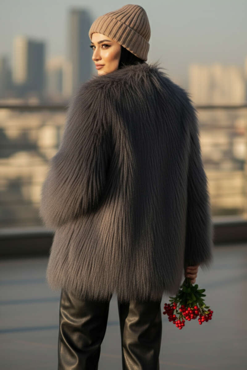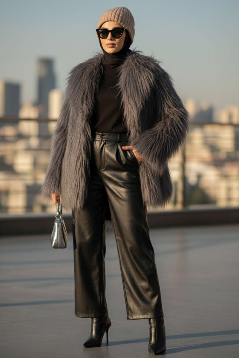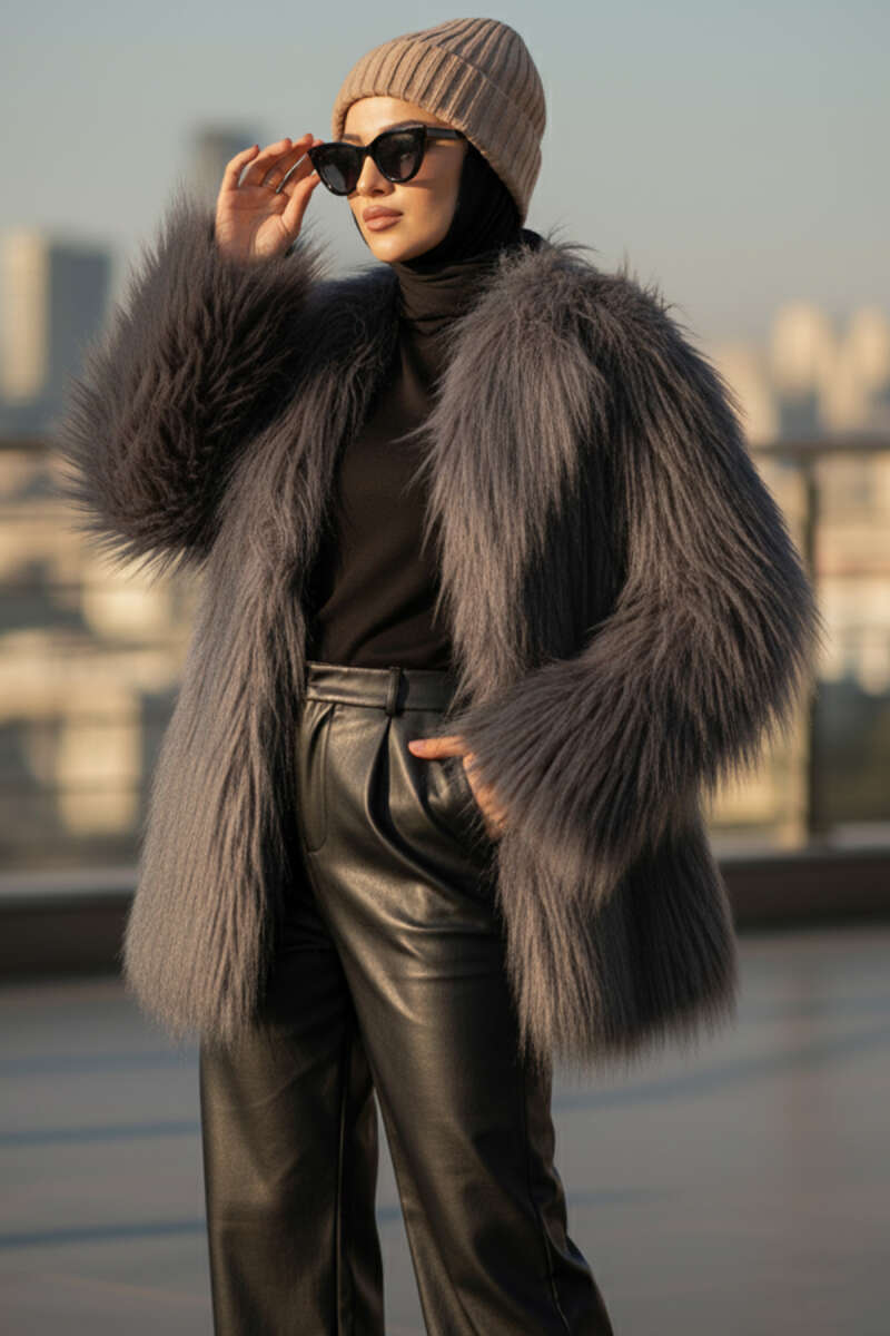 Kruvaze Yaka Kürklü Mont Füme