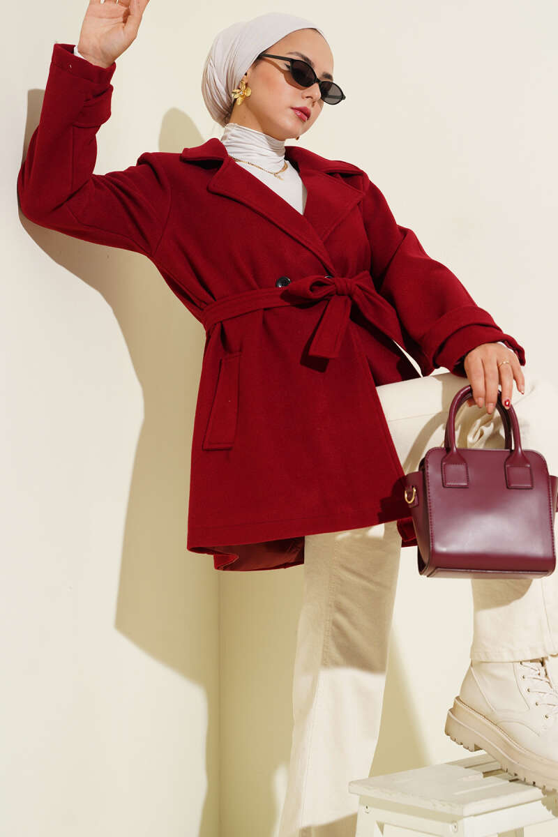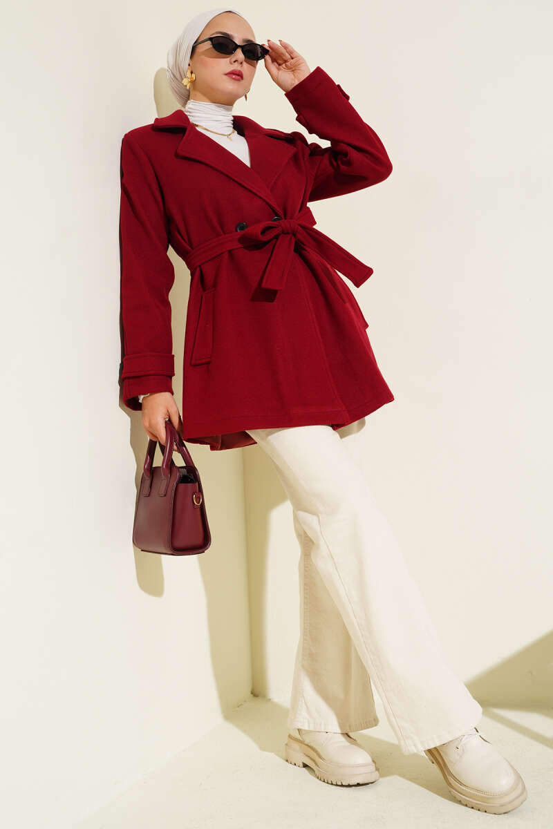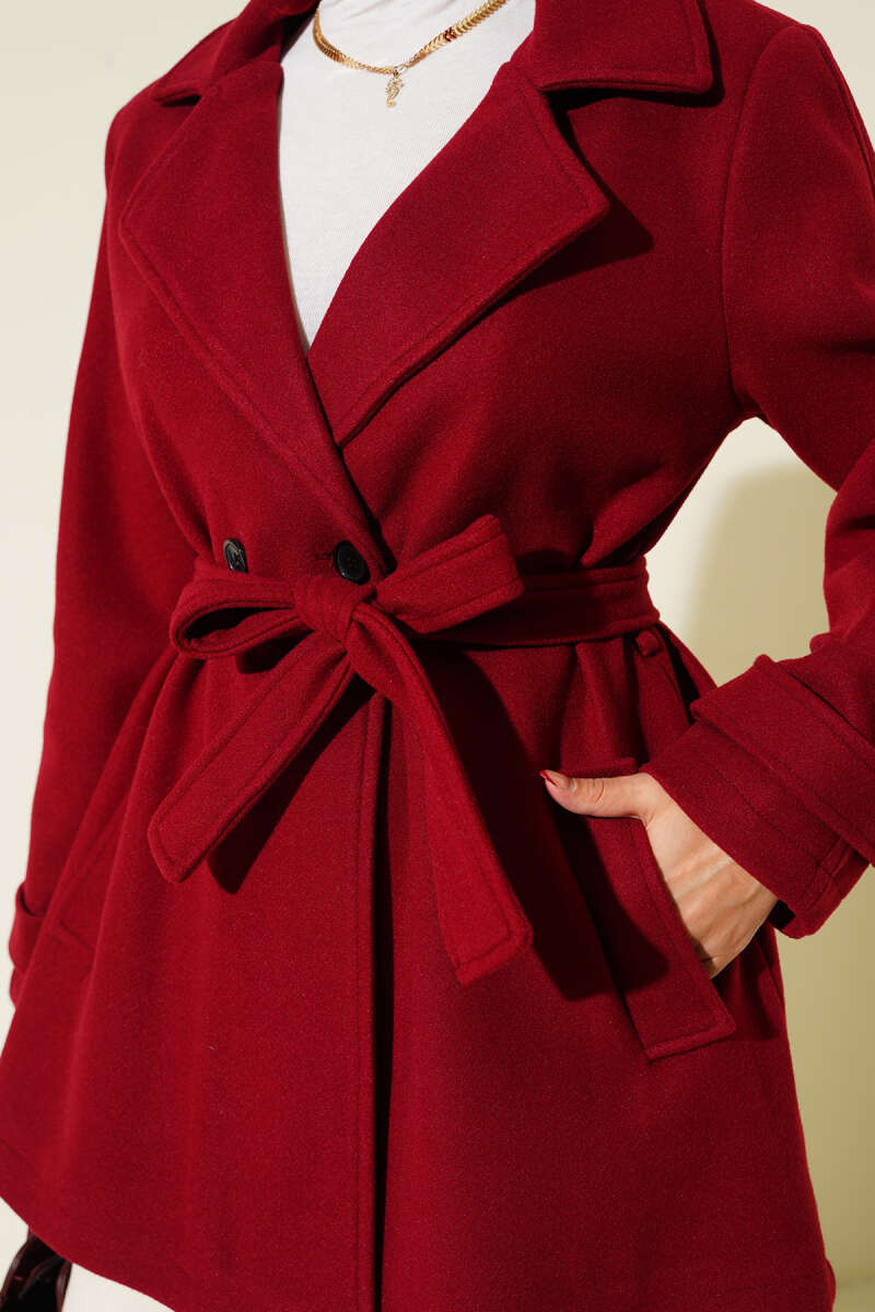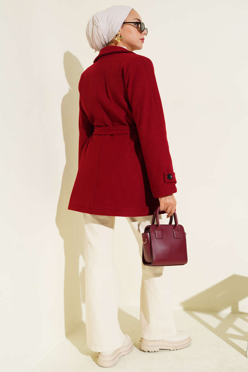 Kruvaze Yaka Kuşak Detaylı Kısa Kaşe Kaban Kırmızı