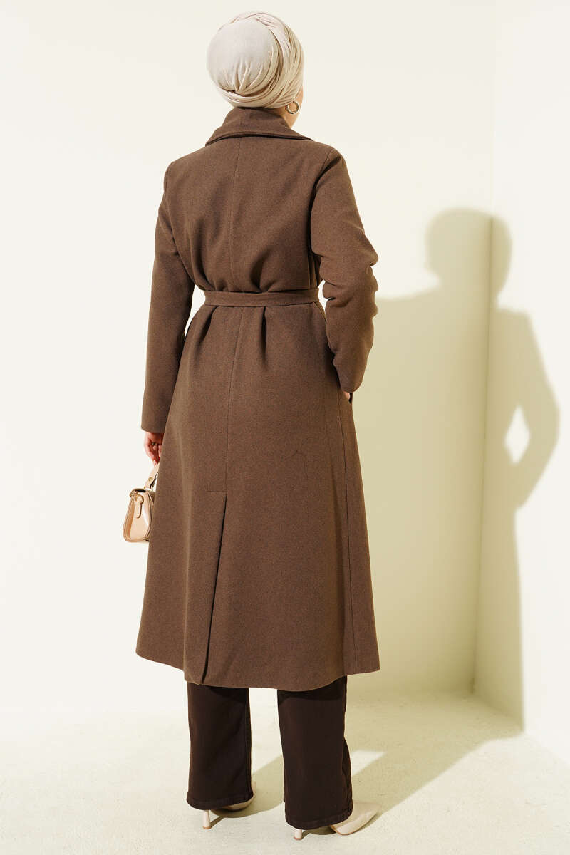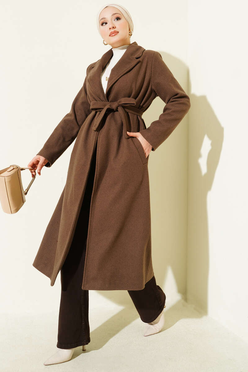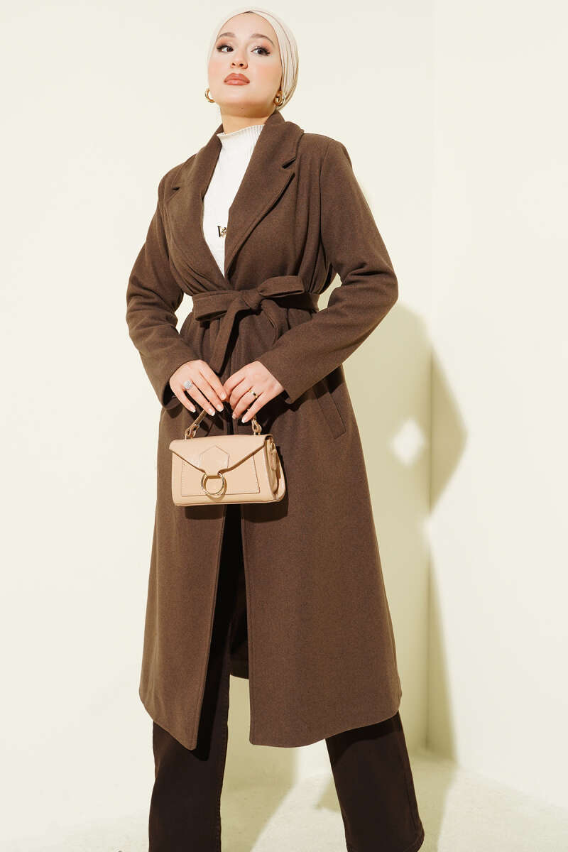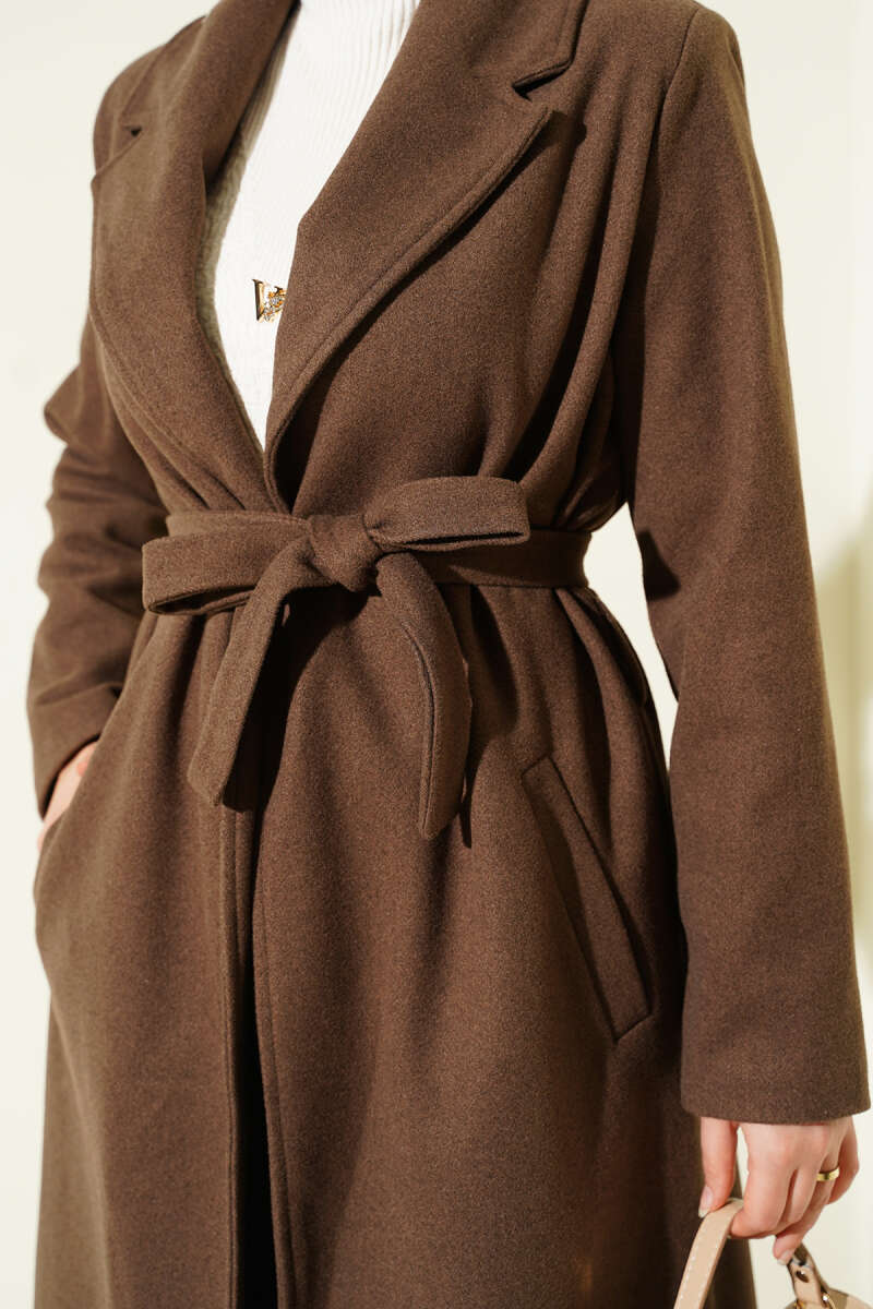 Bel Kuşaklı Astarlı Kaşe Kaban Kahve