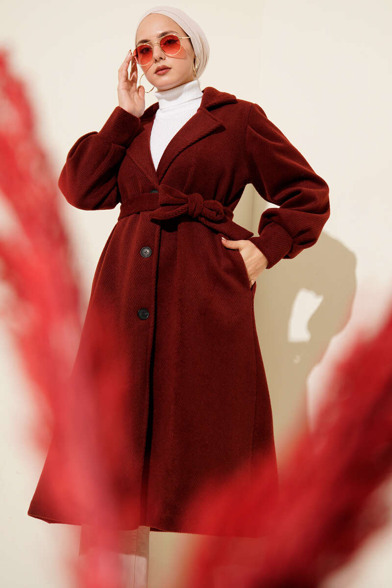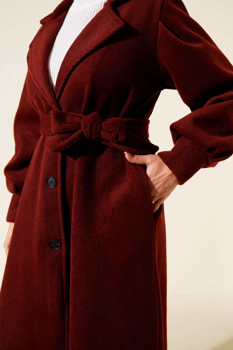 Kuşaklı Düğmeli Kaşe Kaban Bordo