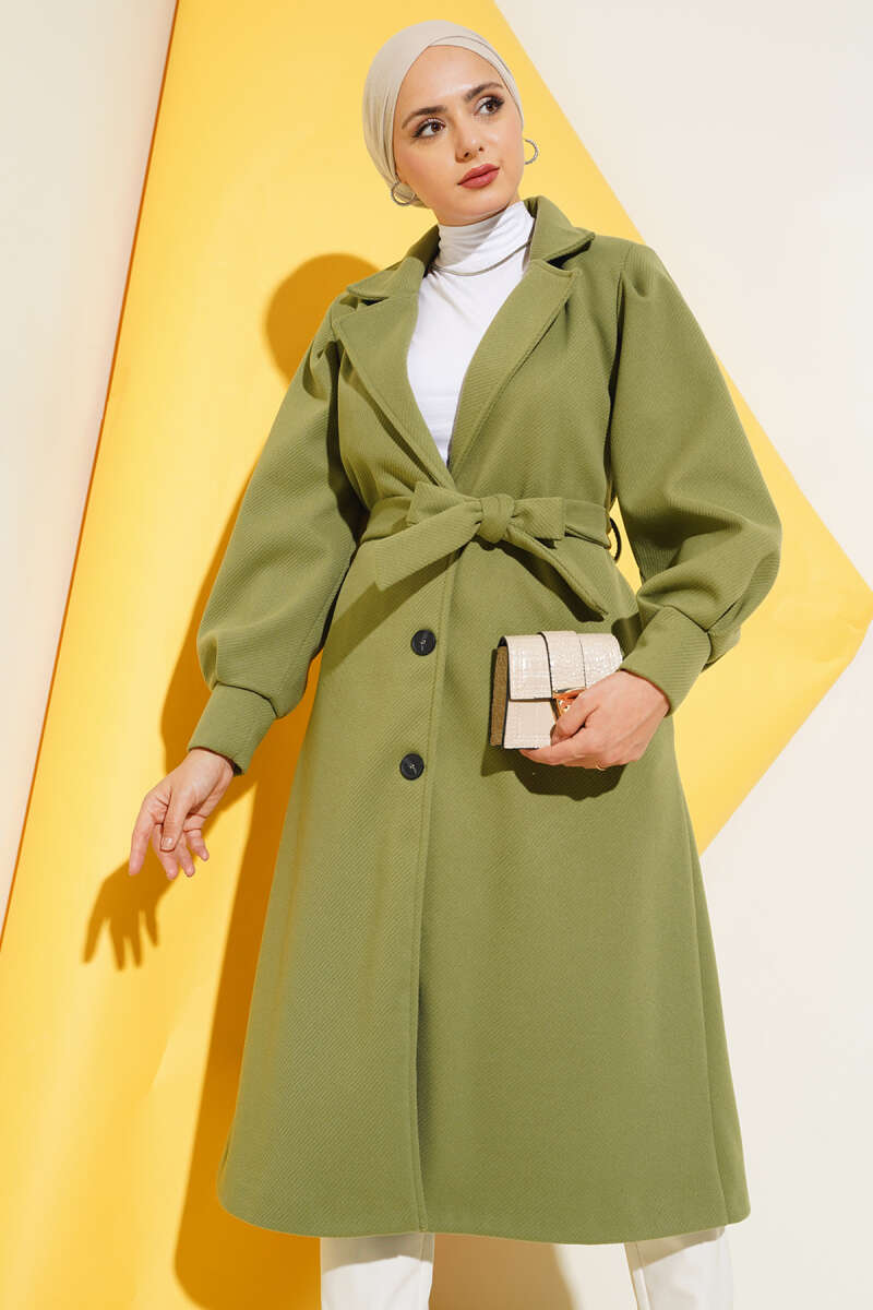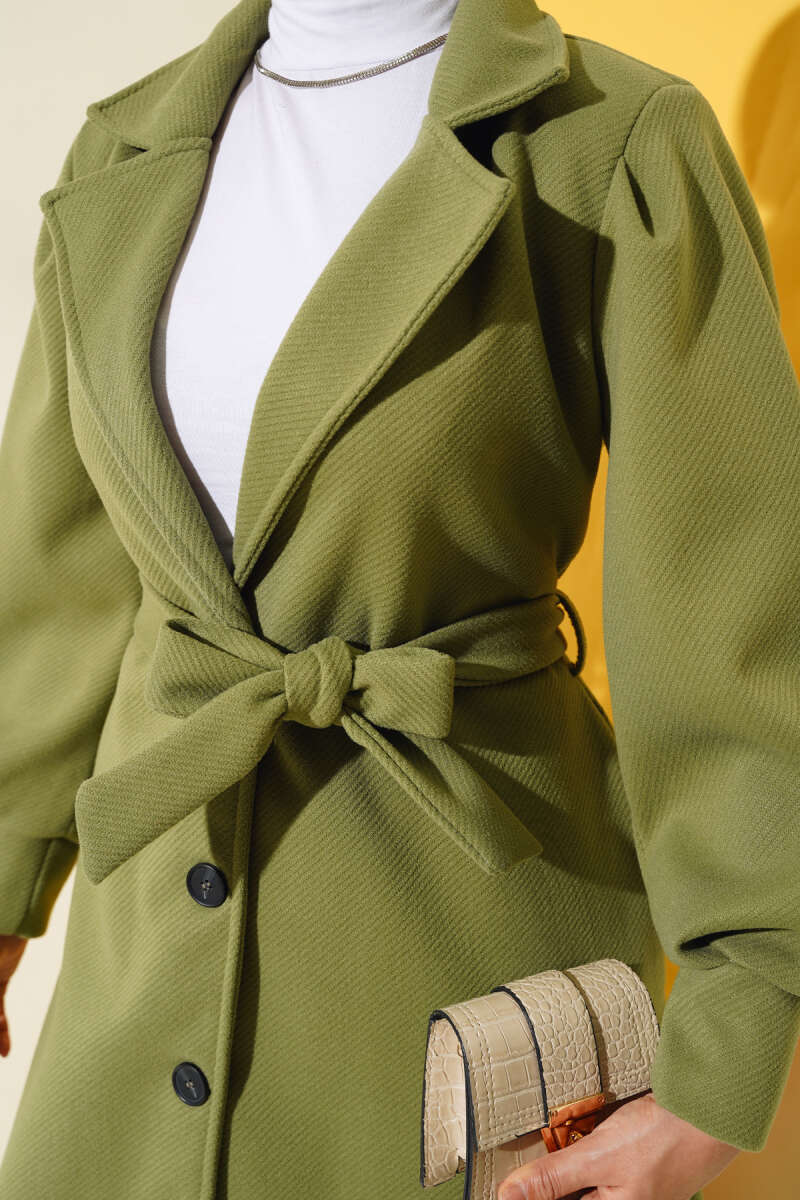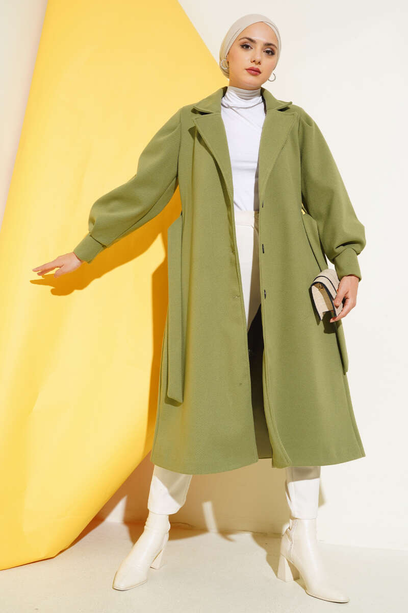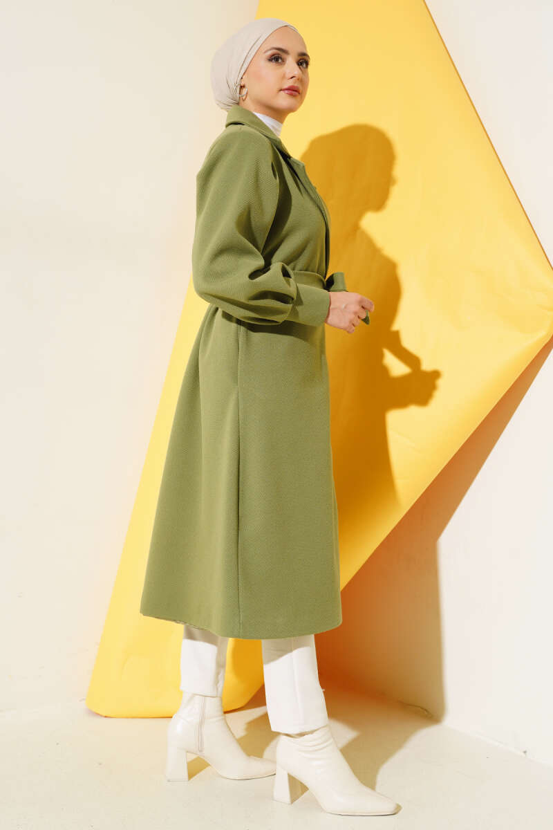 Kruvaze Yaka Kuşaklı Astarlı Kaşe Kaban Çağla Yeşili
