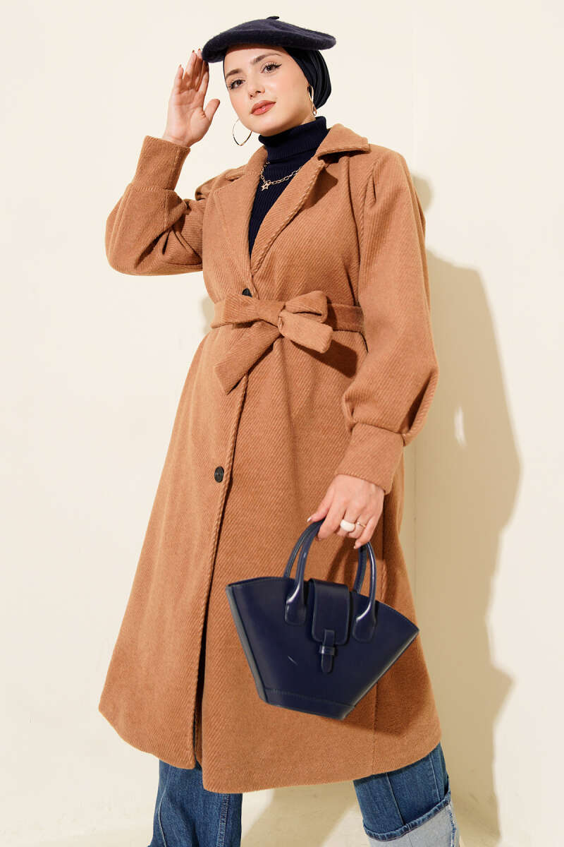 Kruvaze Yakalı Kuşaklı Uzun Kaşe Kaban Bej