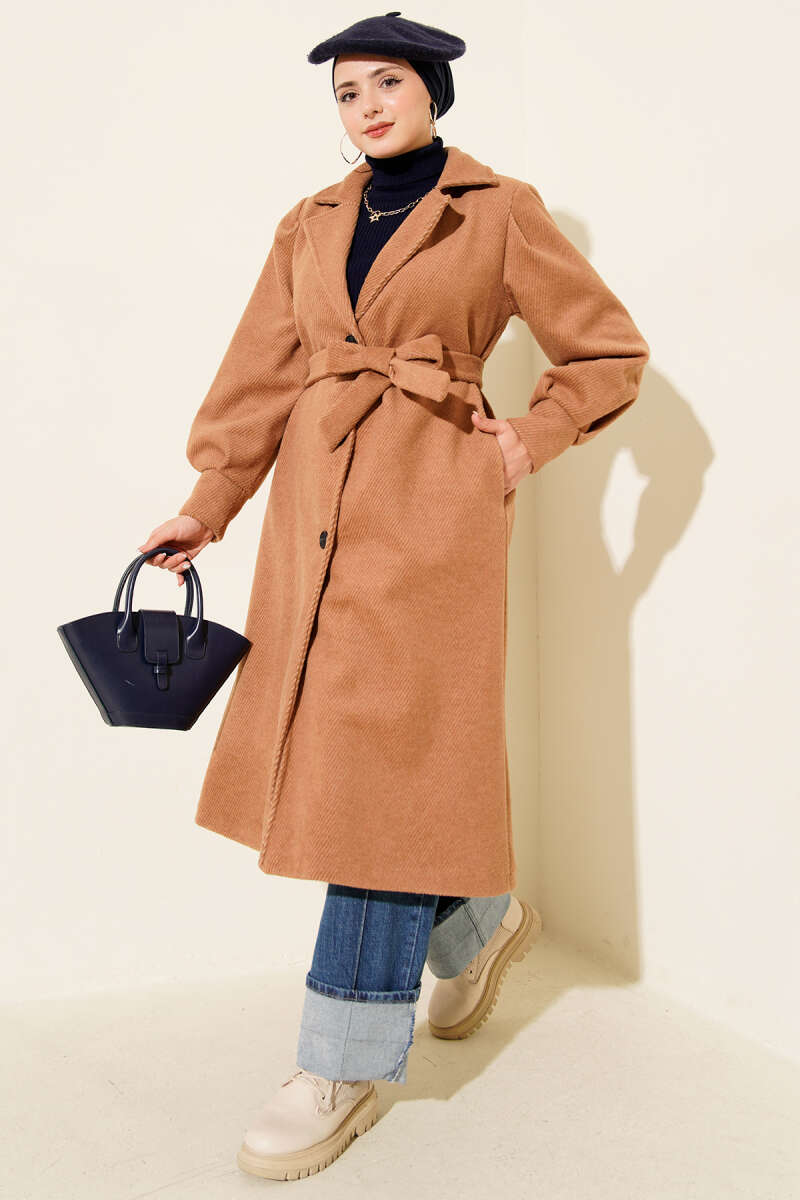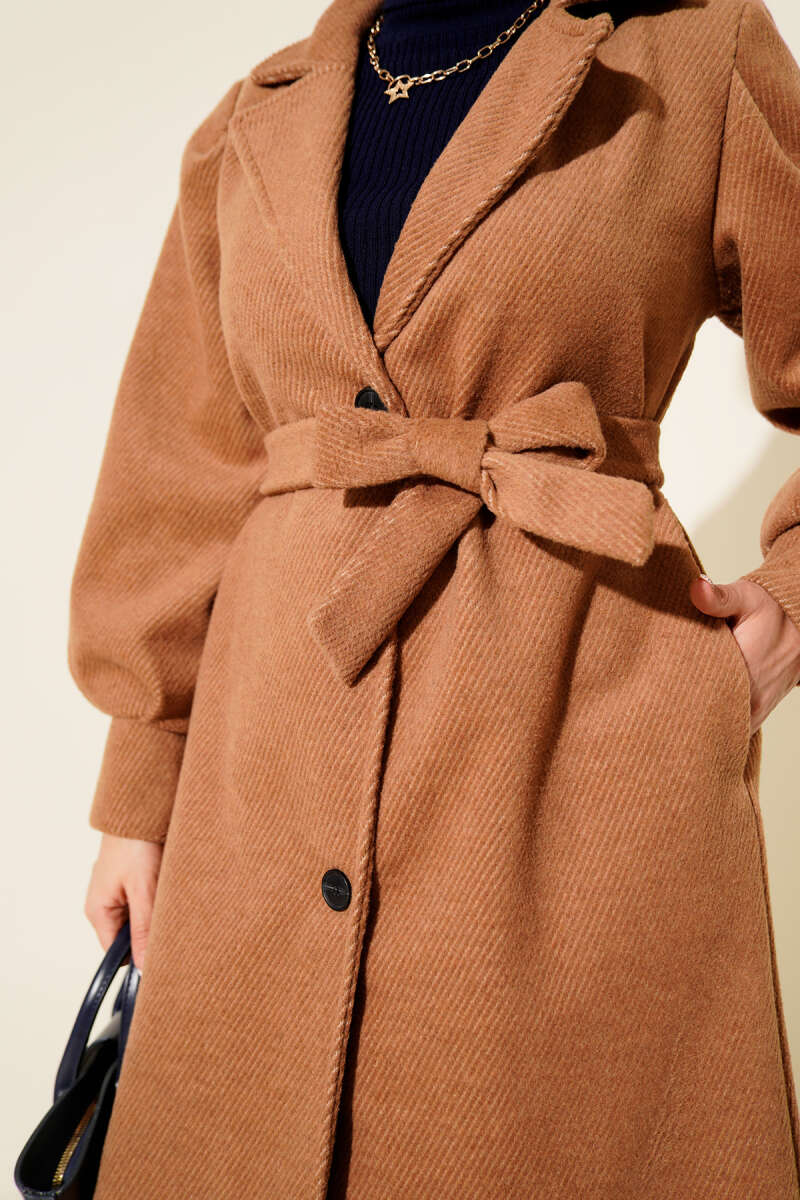 Kuşaklı Düğmeli Kaşe Kaban Taba