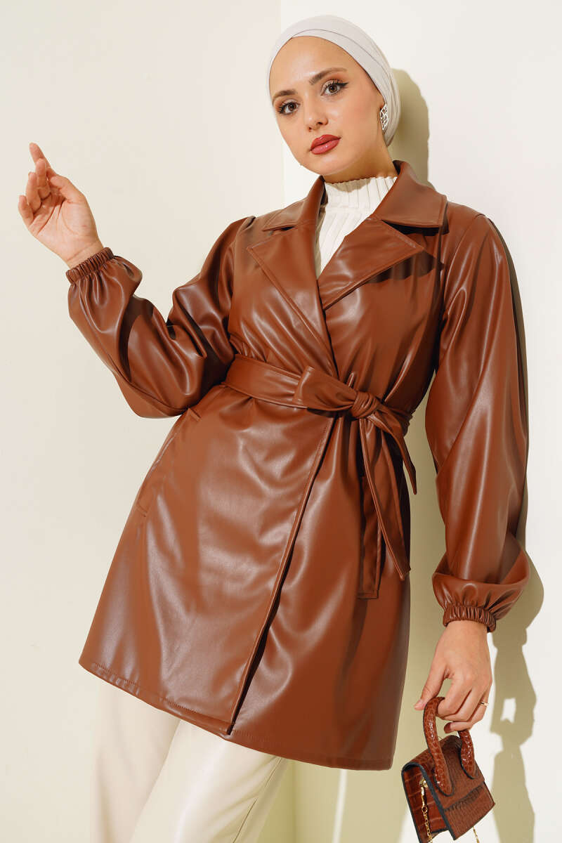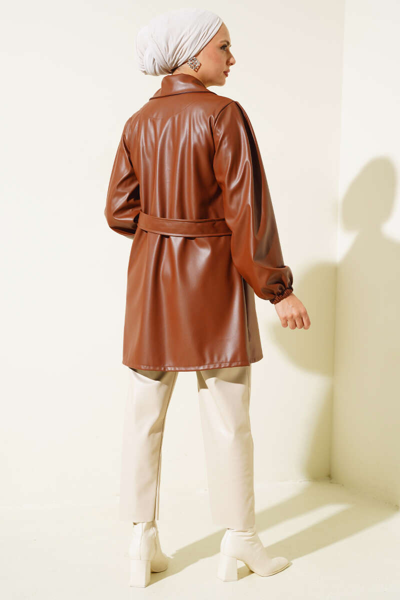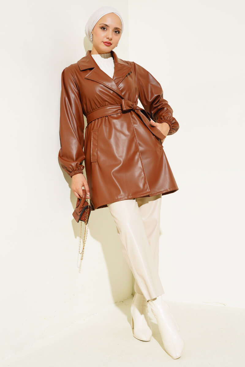 Kruvaze Yaka Kuşaklı Deri Ceket Kahve