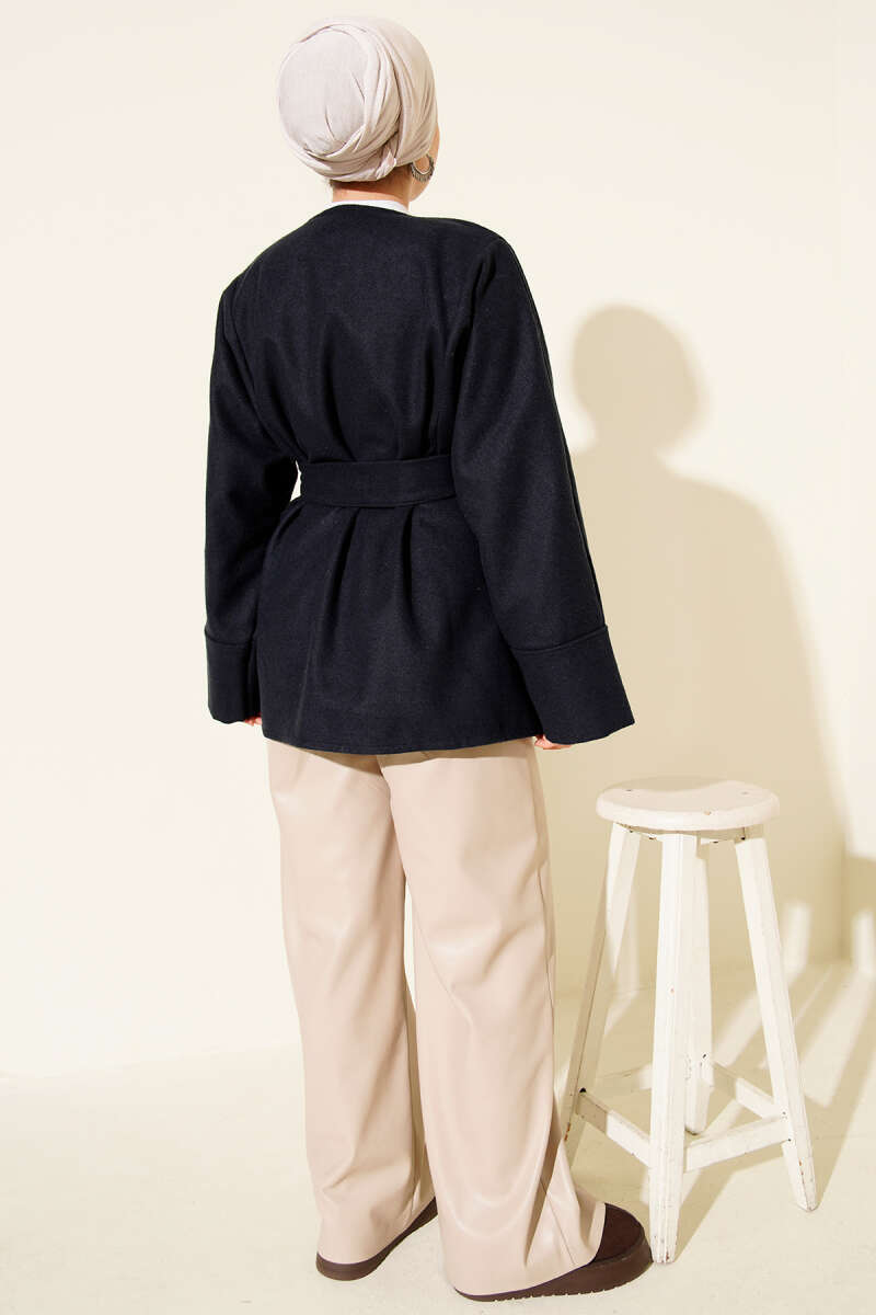 Kruvaze Yaka Kuşaklı Kaşe Ceket Lacivert