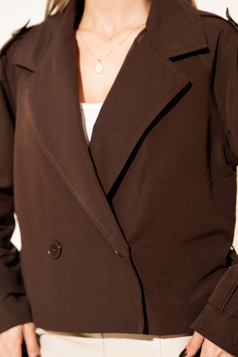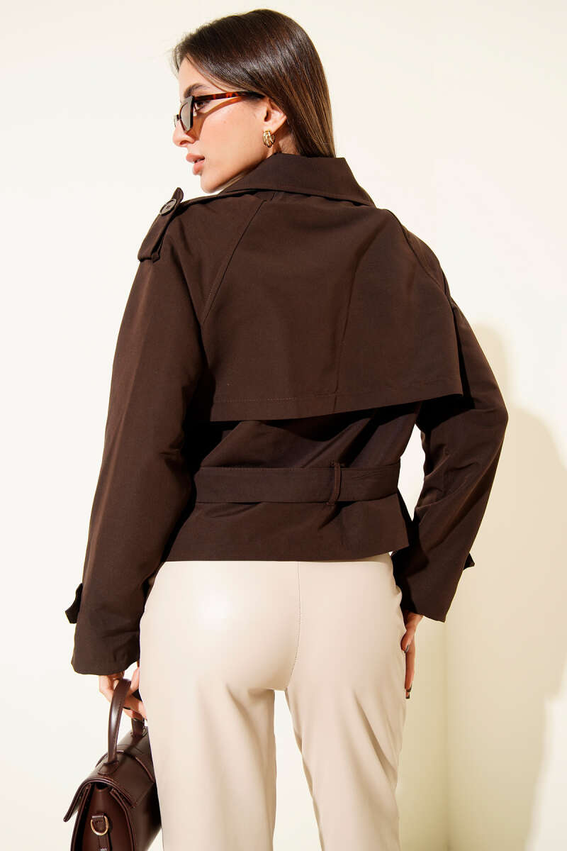 Kruvaze Yaka Kuşaklı Kısa Trençkot Kahve