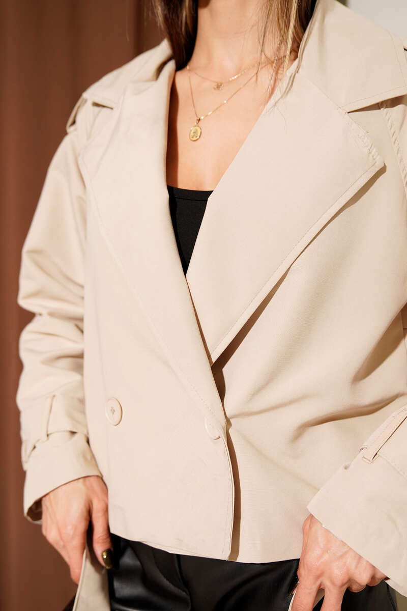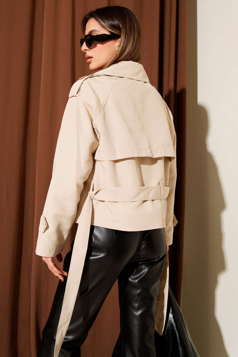 Kruvaze Yaka Kuşaklı Kısa Trençkot Taş