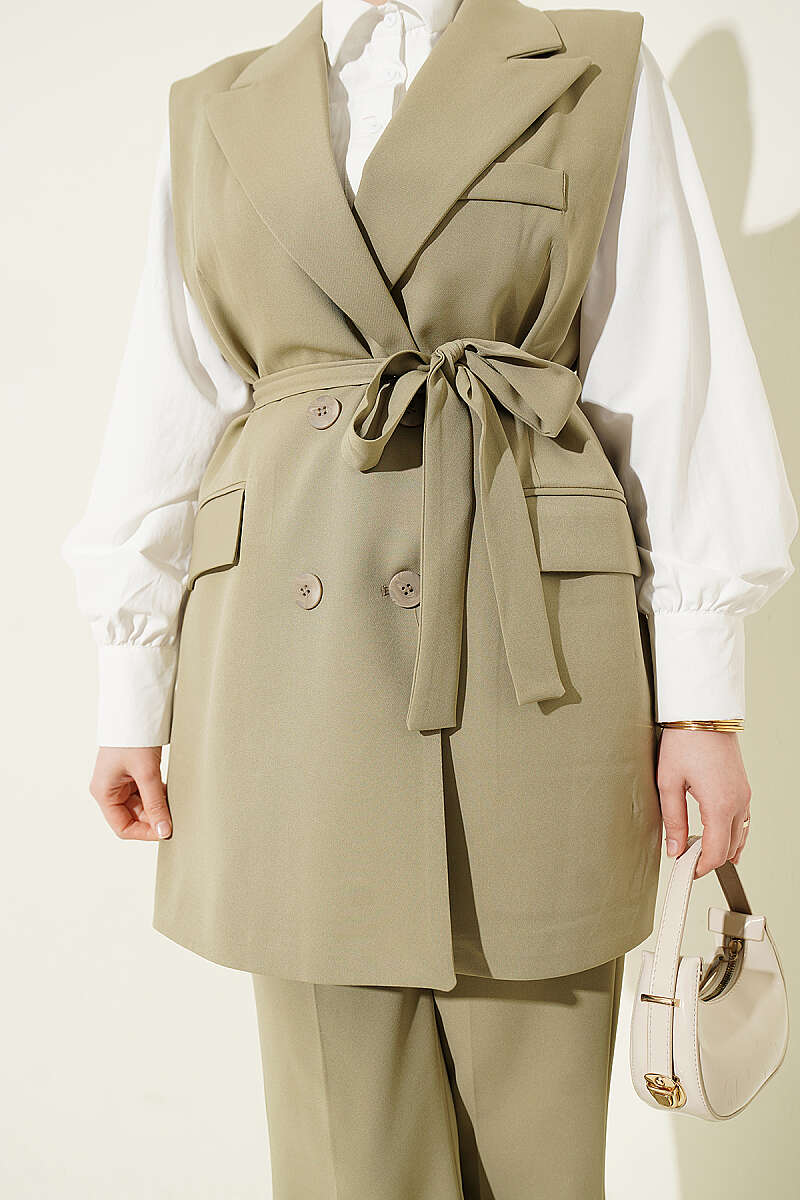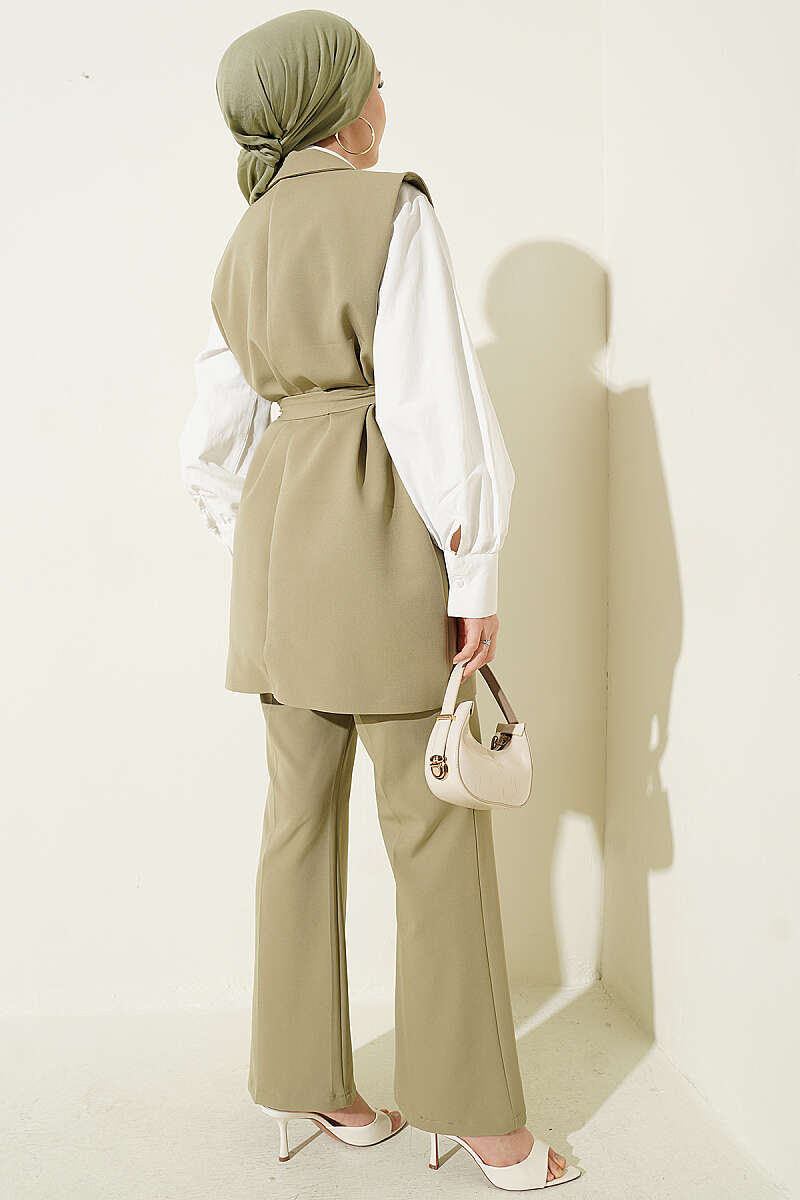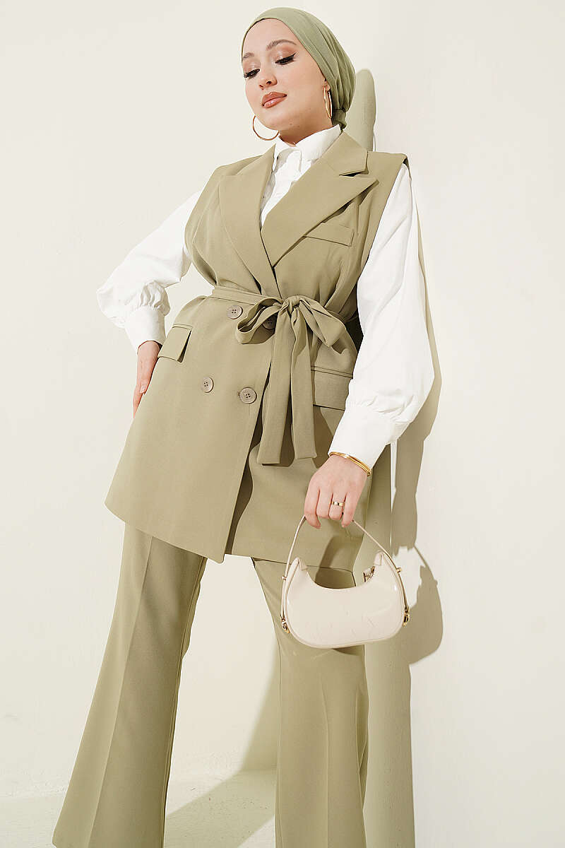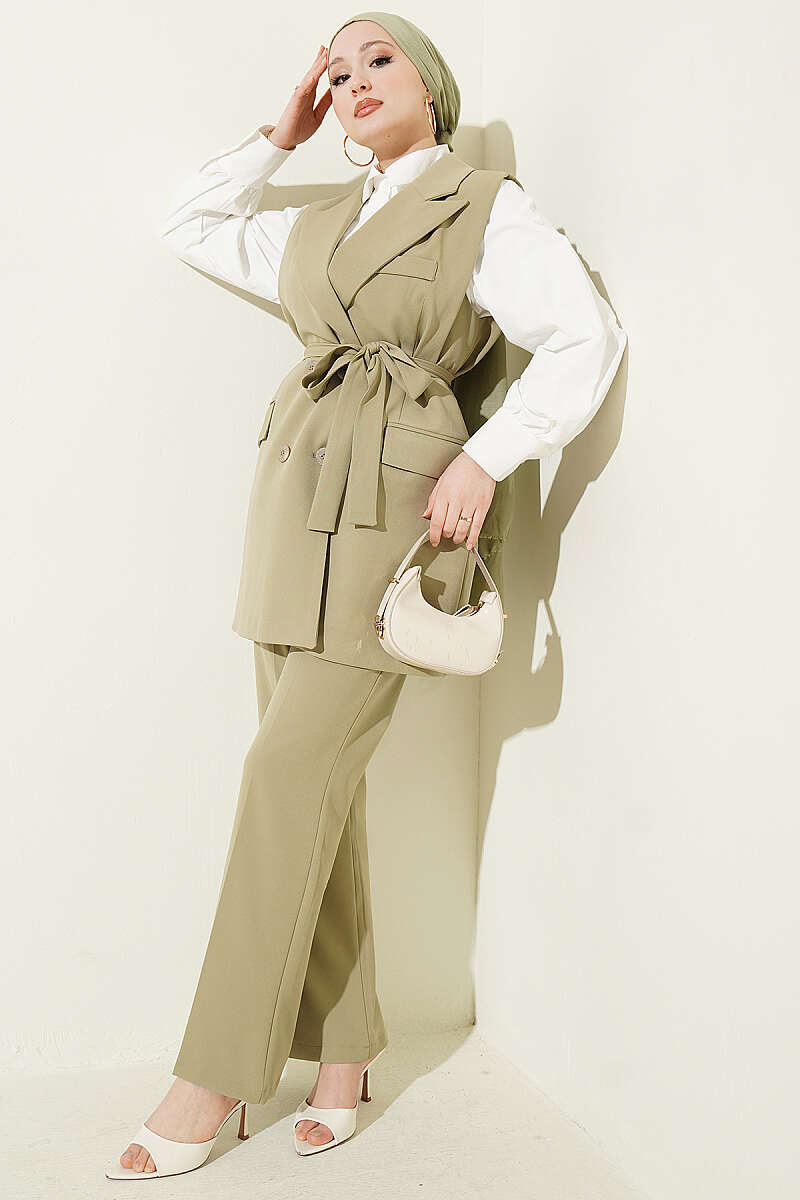 Zarif ve maskülen çizgilerin harmanlandığı bu yelekli ikili takım, kruvaze yaka kesimi ve ön kısmındaki düğme detaylarıyla sofistike bir duruş sergiler. Belindeki geniş kuşak bağlaması silueti vurgulayarak daha formda bir görünüm sunarken, yeleğin yanlarındaki kapaklı cep detayları tasarıma fonksiyonel bir şıklık katar. Takımı tamamlayan ütü izli klasik kesim pantolonuyla hem ofis ortamında hem de özel davetlerde zahmetsiz bir zarafet sunan bu set, modern şehirli kadının gardırobunda vazgeçilmez bir parça olmaya adaydır.