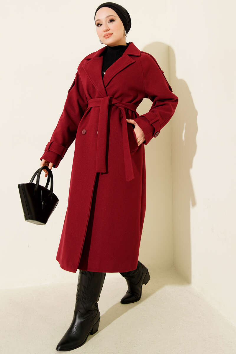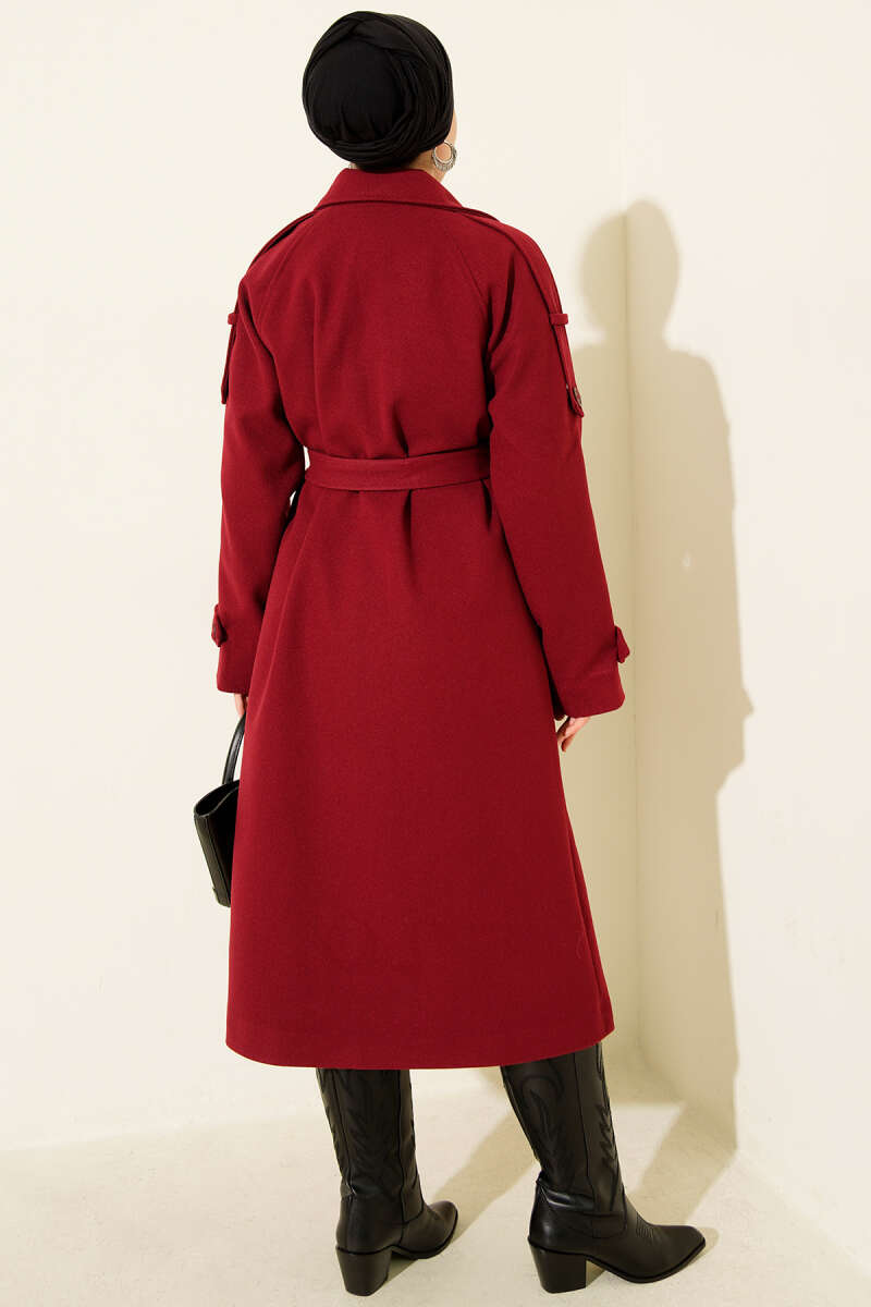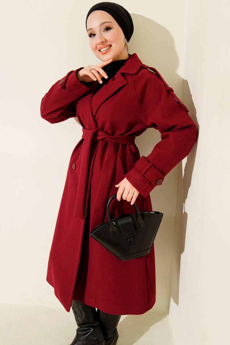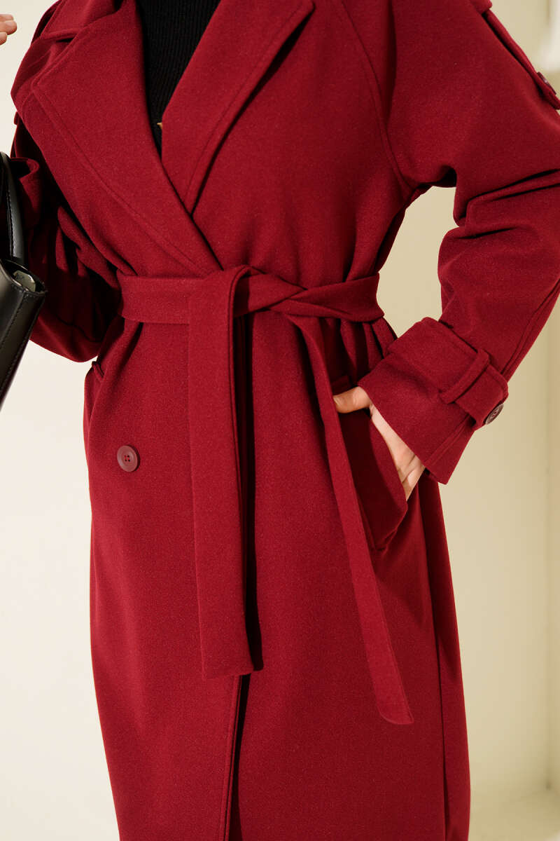 İki Düğmeli Kruvaze Yaka Kaşe Kaban Bordo