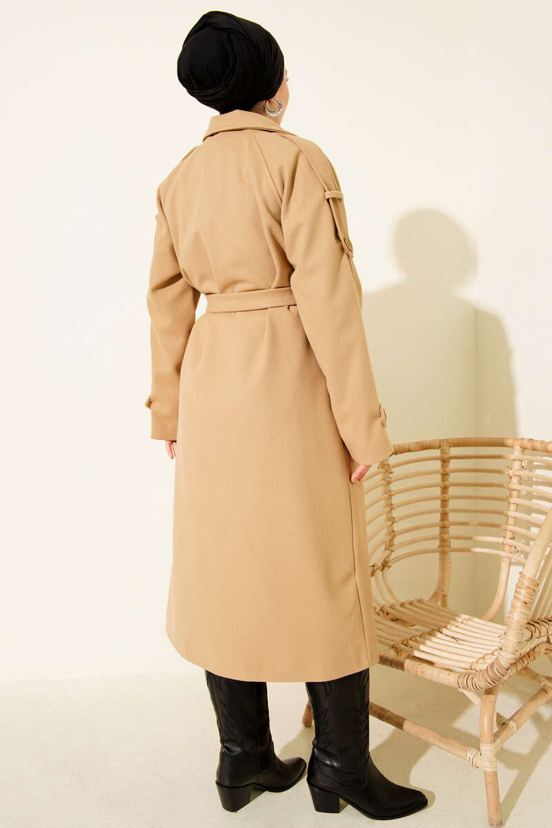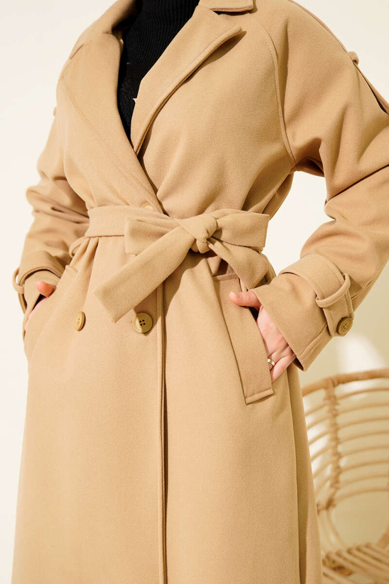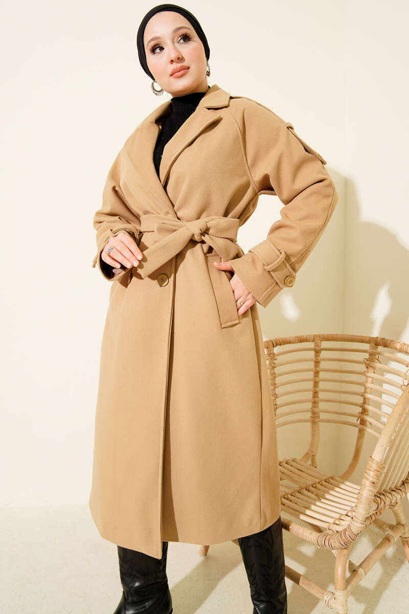 Kruvaze Yaka Altı Düğmeli Kaşe Kaban Latte