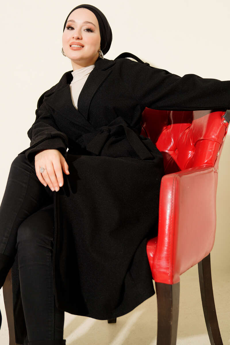 İki Düğmeli Kruvaze Yaka Kaşe Kaban Siyah