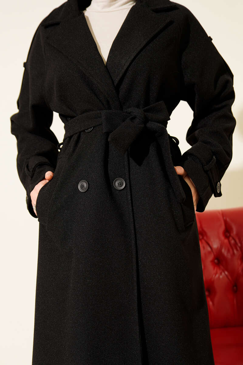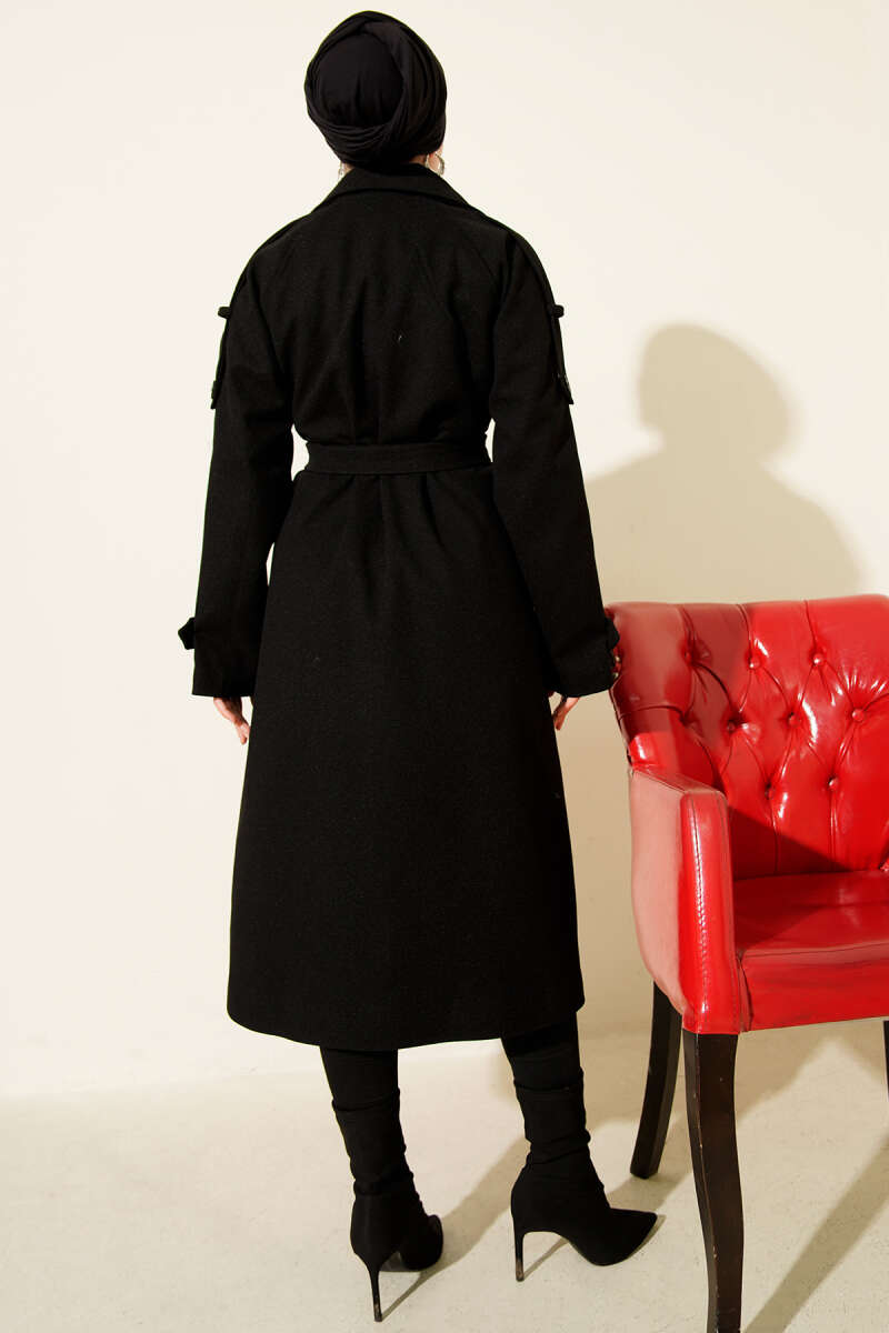 Kol Düğme Detaylı Kruvaze Kaban Siyah