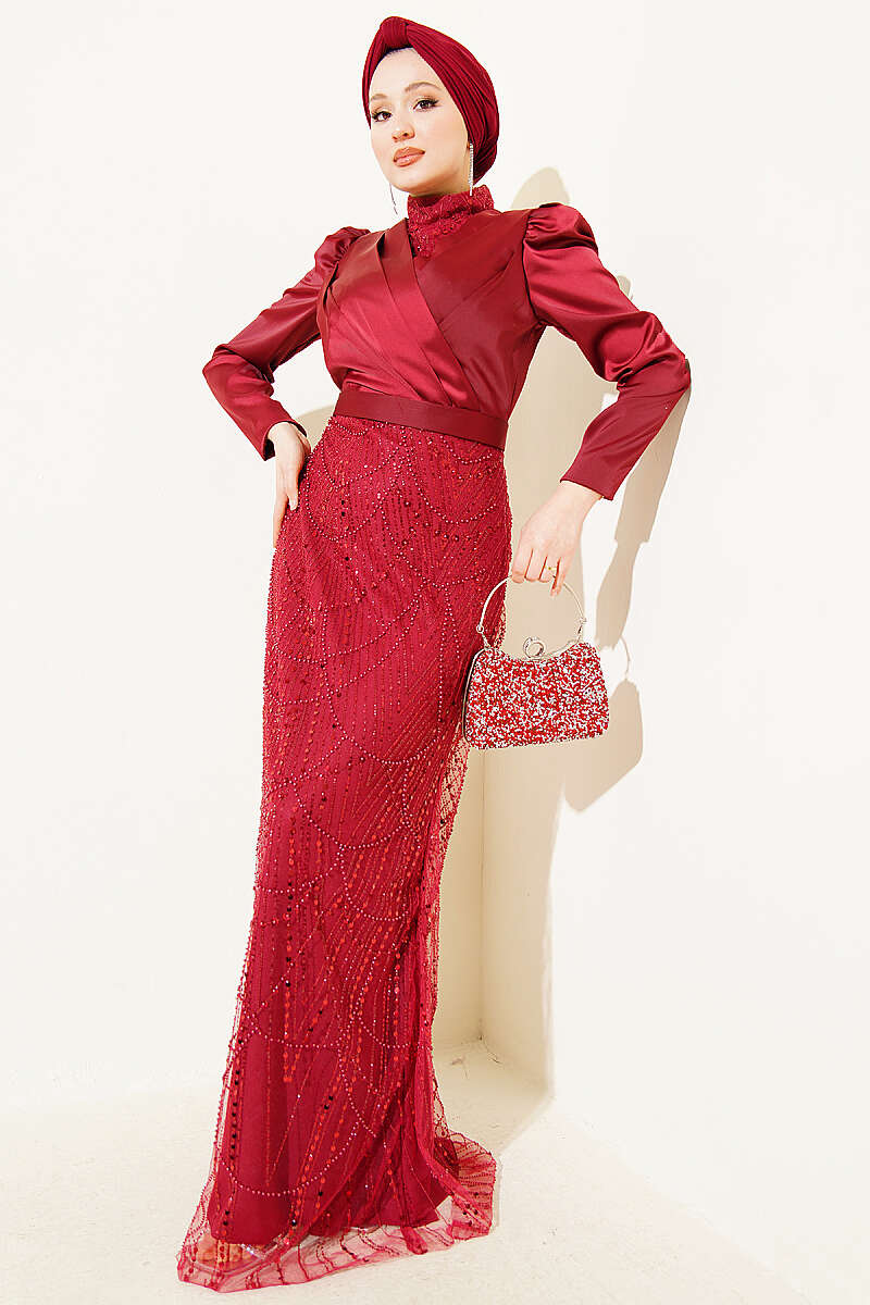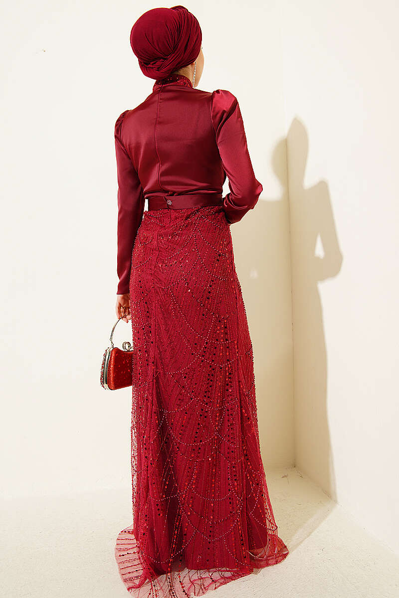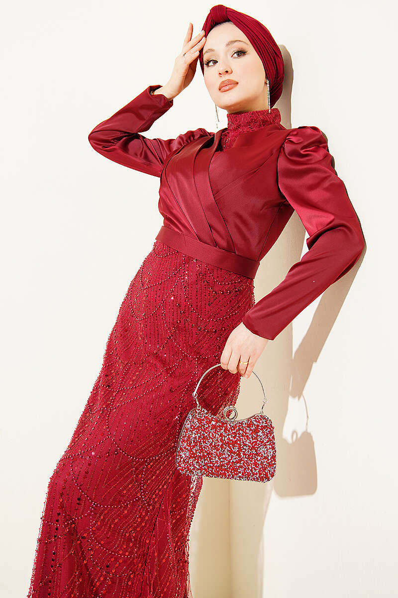 Kruvaze Yaka Pul Payet Abiye Elbise Bordo