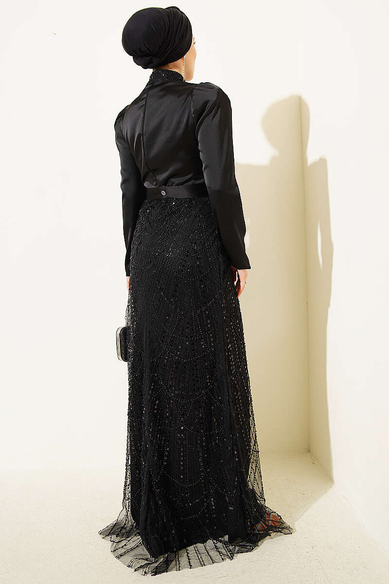 Kruvaze Yaka Pul Payet Abiye Elbise Siyah
