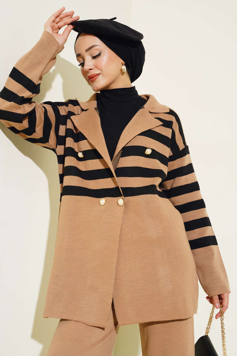 İnci Süslemeli Etekli Triko İkili Takım Kahve