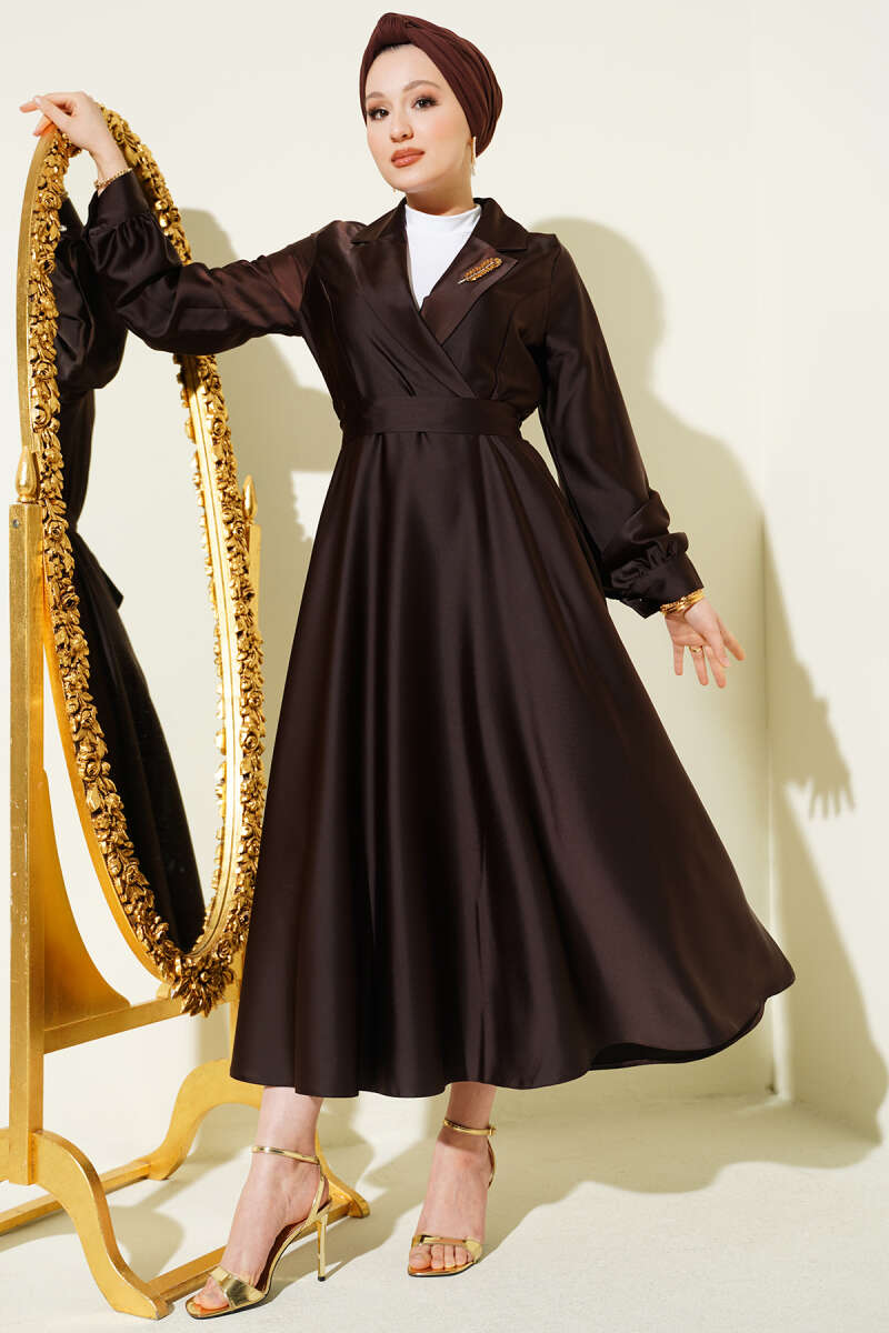 Gold Aksesuarlı Balon Kol Abiye Elbise Kahve