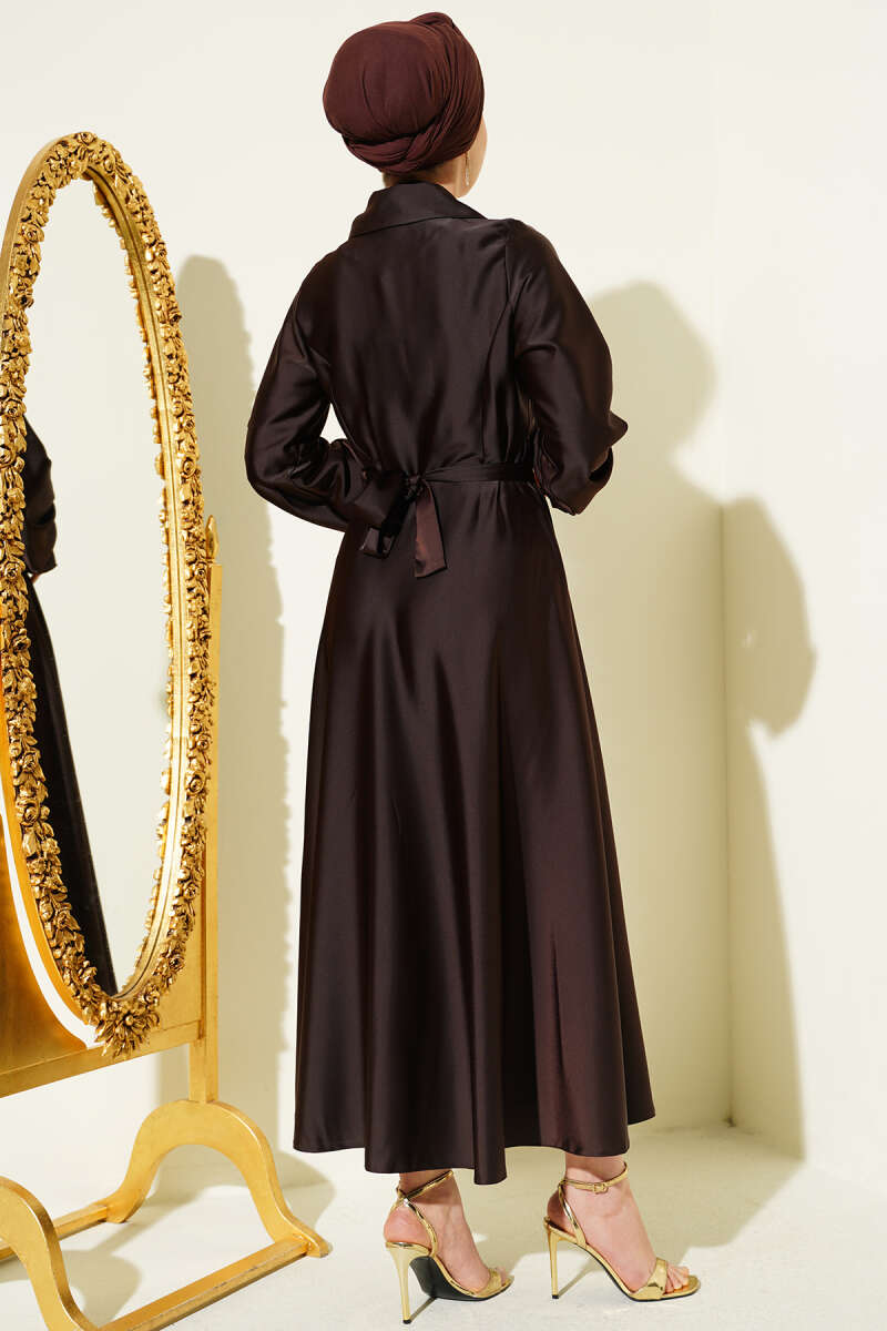 Kruvaze Yaka Taşlı Saten Abiye Elbise Kahve