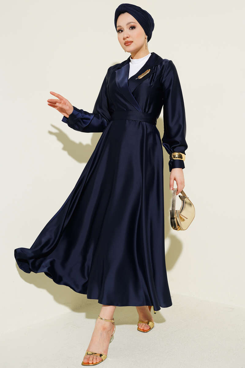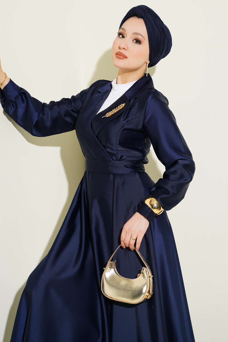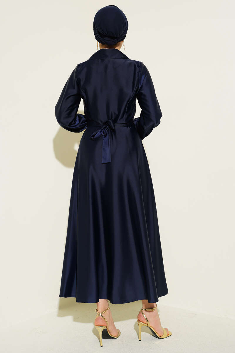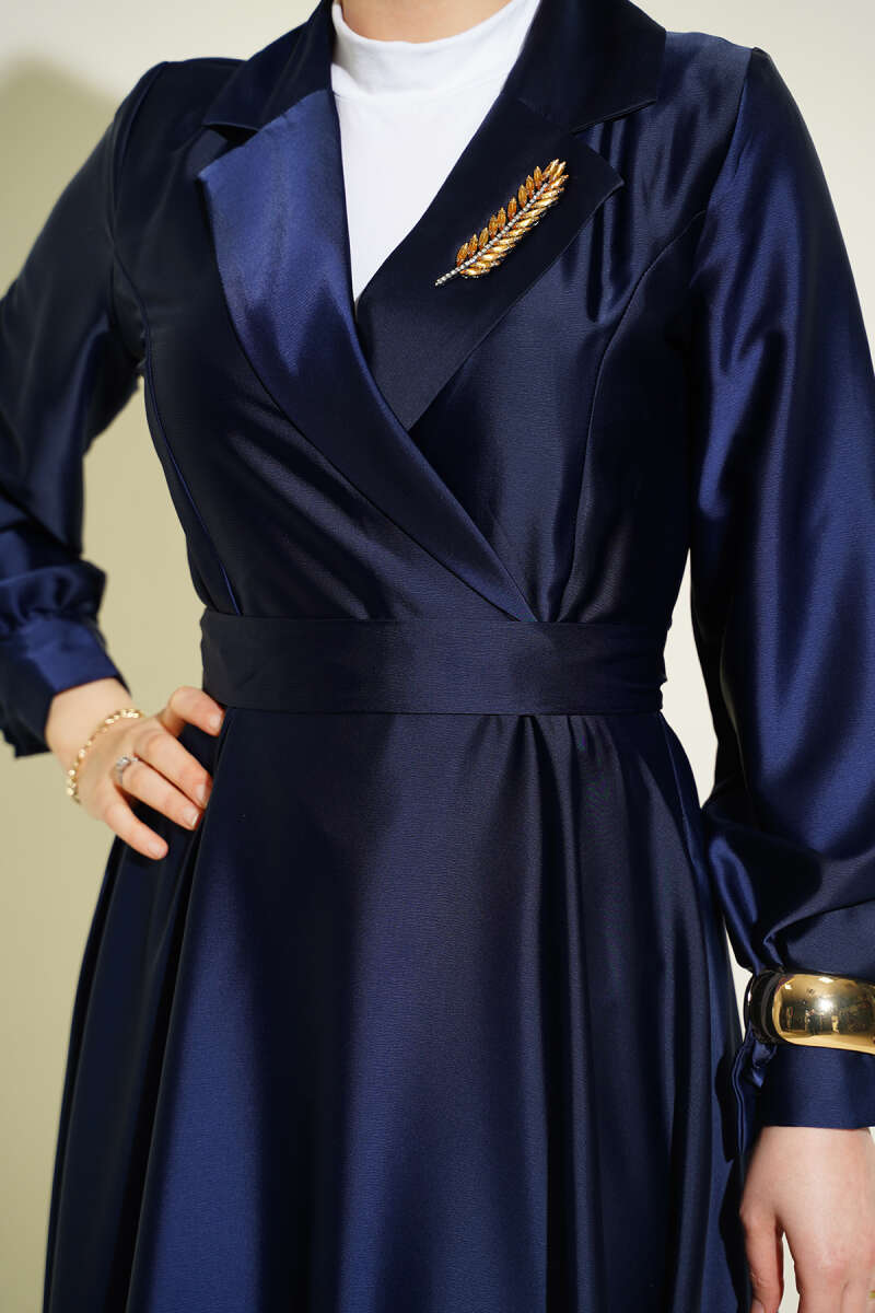 Kruvaze Yaka Taşlı Saten Abiye Elbise Lacivert