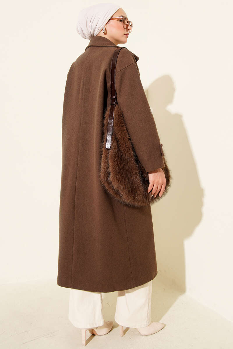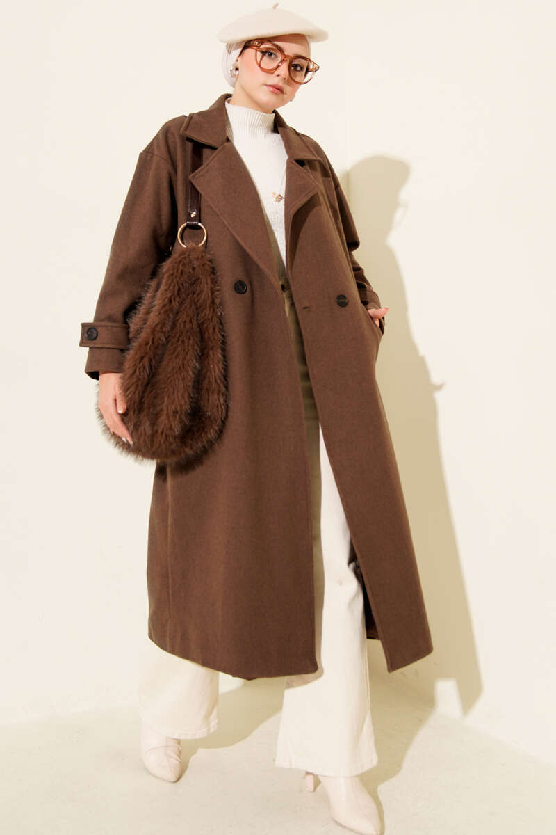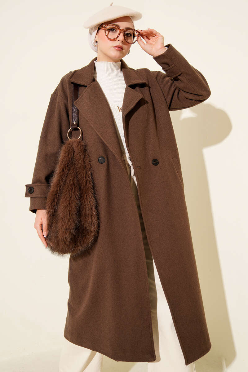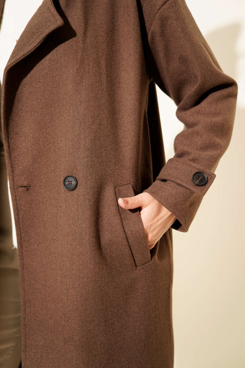 Kruvaze Yaka Uzun Kaşe Kaban Kahve