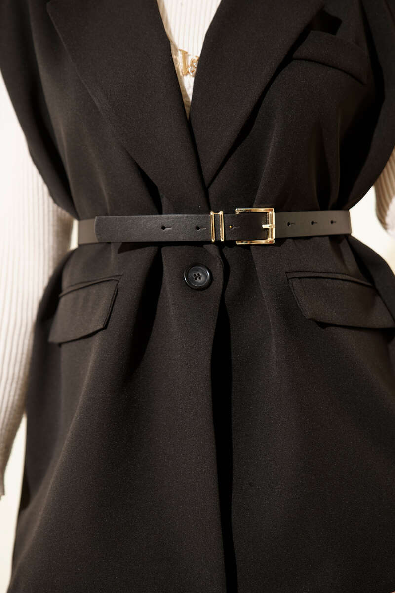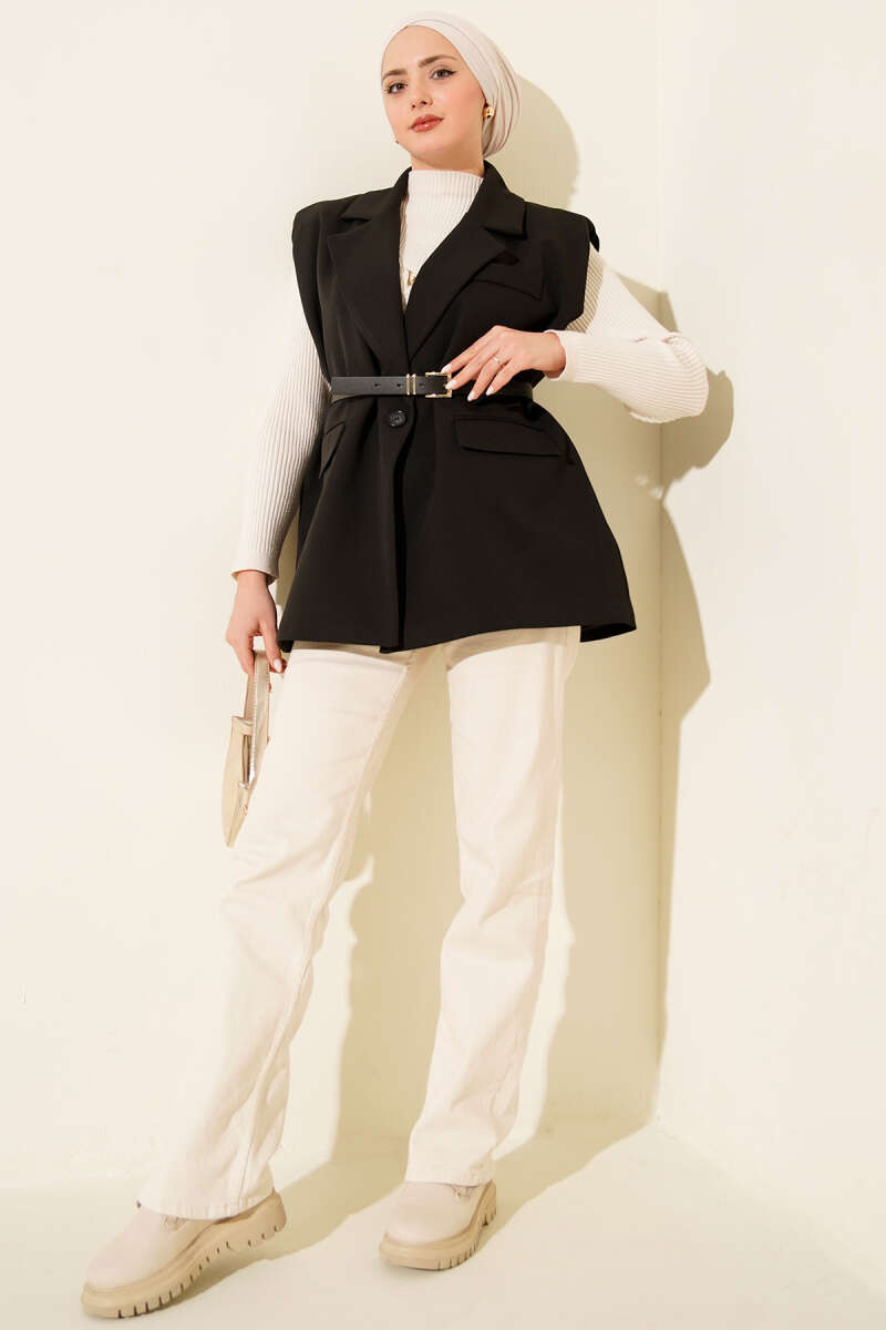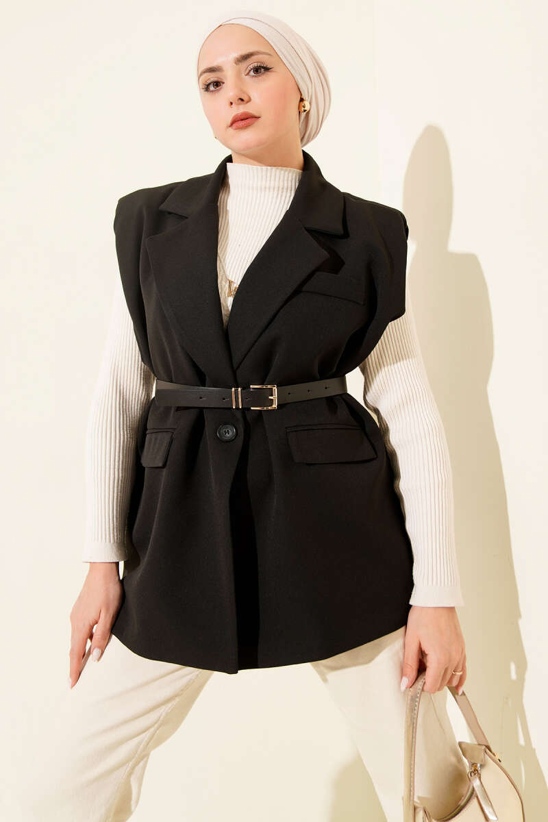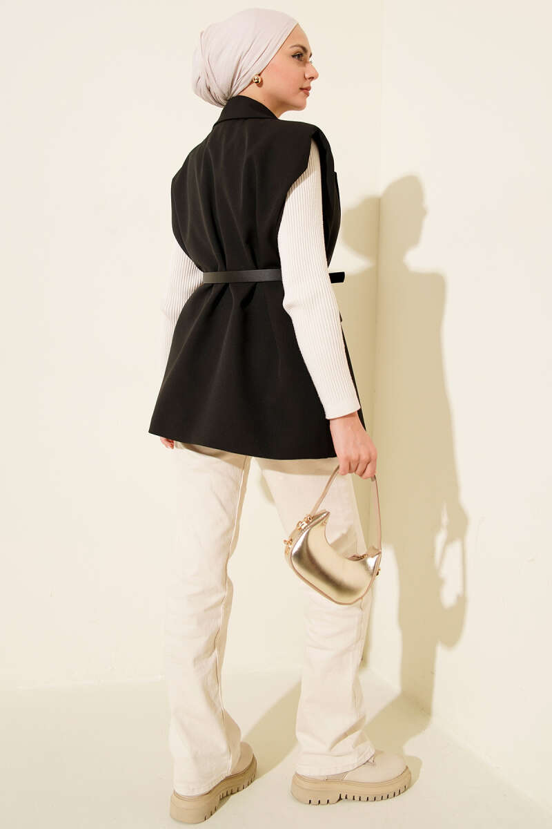 Kruvaze Yaka Vatkalı Kemerli Yelek Siyah