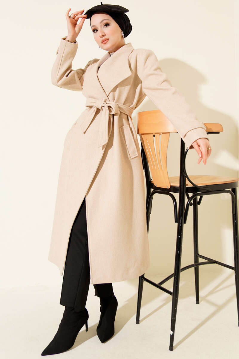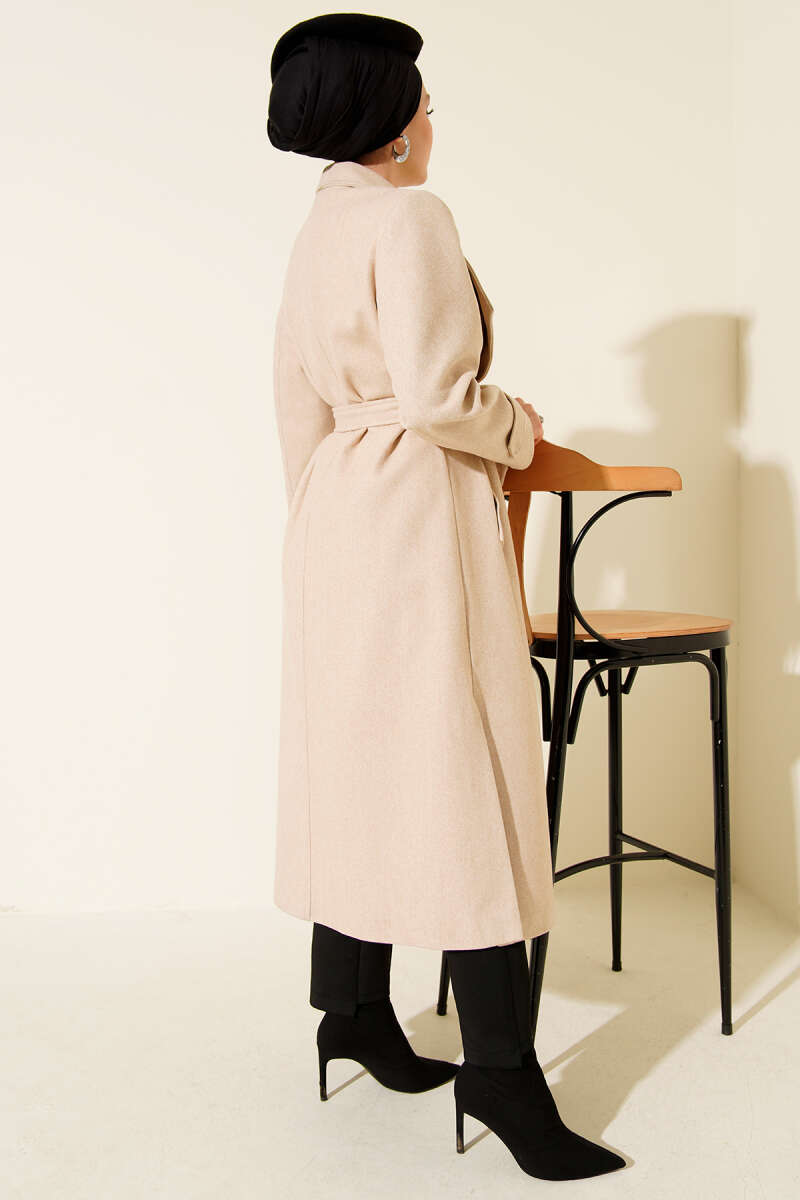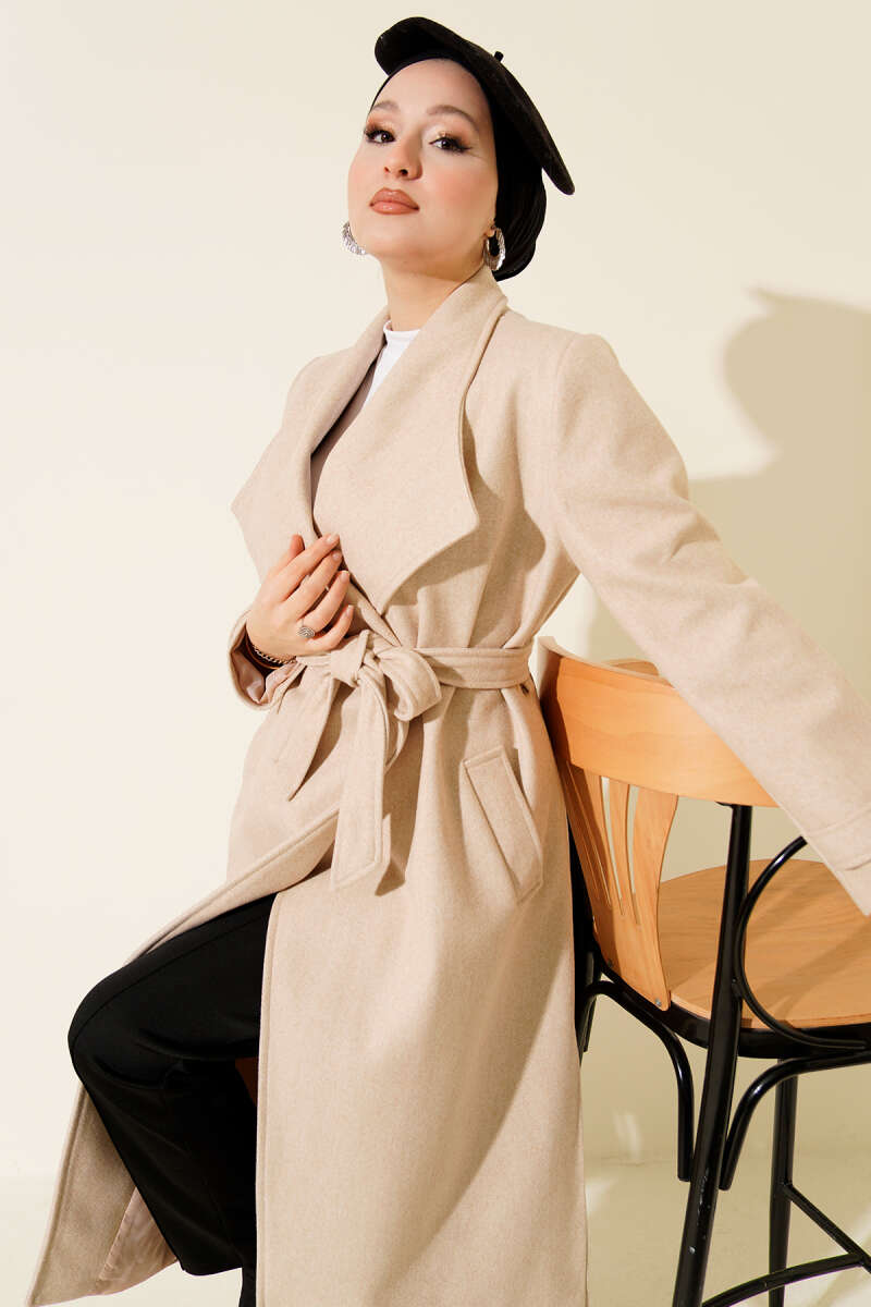 Bebe Yaka Kuşaklı Kaşe Kaban Taş