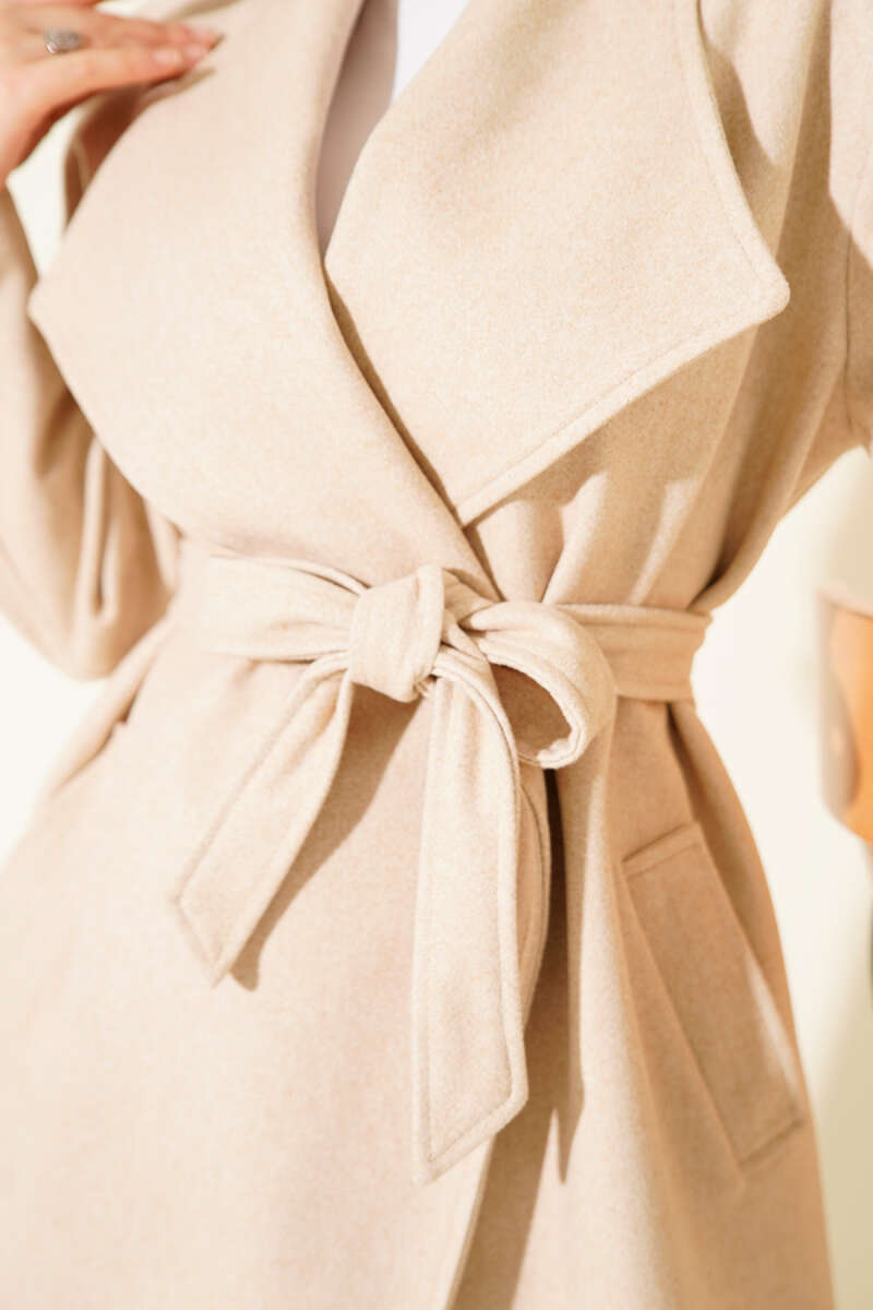 Bebe Yaka Kuşaklı Kaşe Kaban Taba