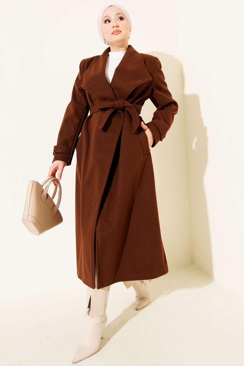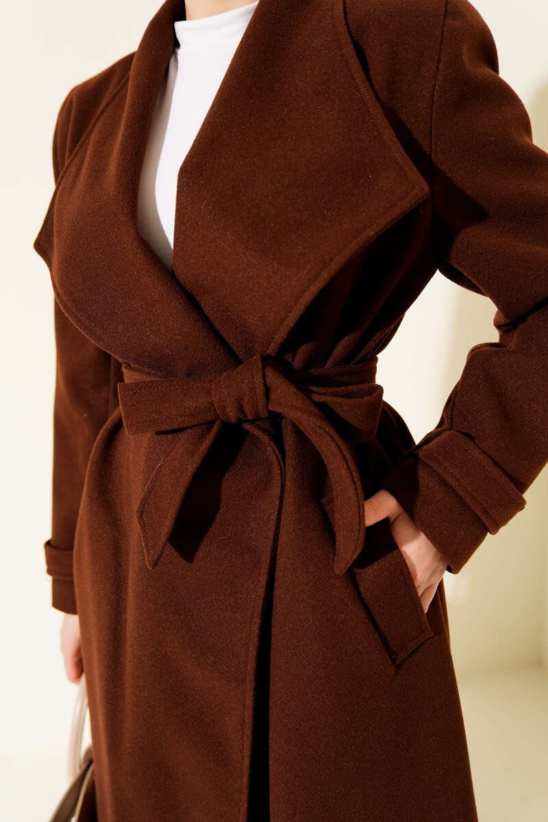 Kruvaze Yakalı Kuşaklı Uzun Kaşe Kaban Taş