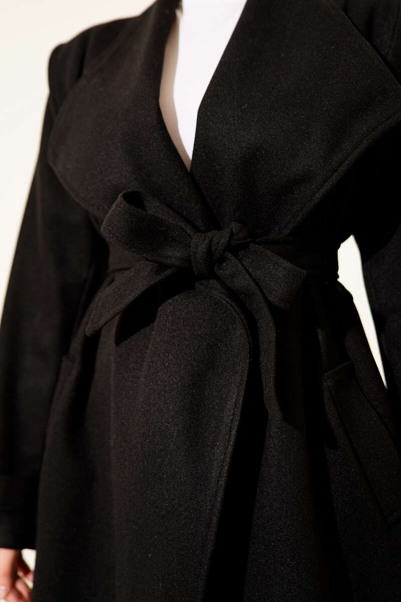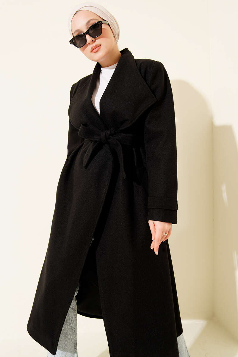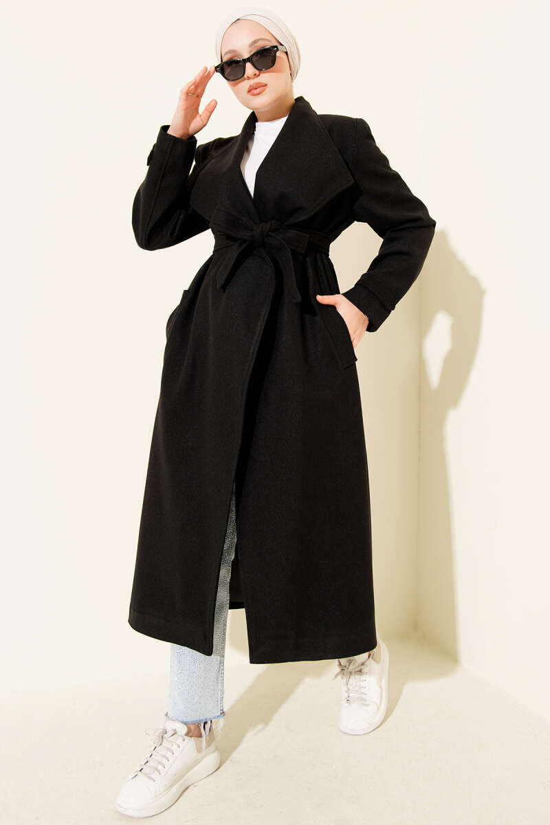 Kruvaze Yakalı Kuşaklı Uzun Kaşe Kaban Taş